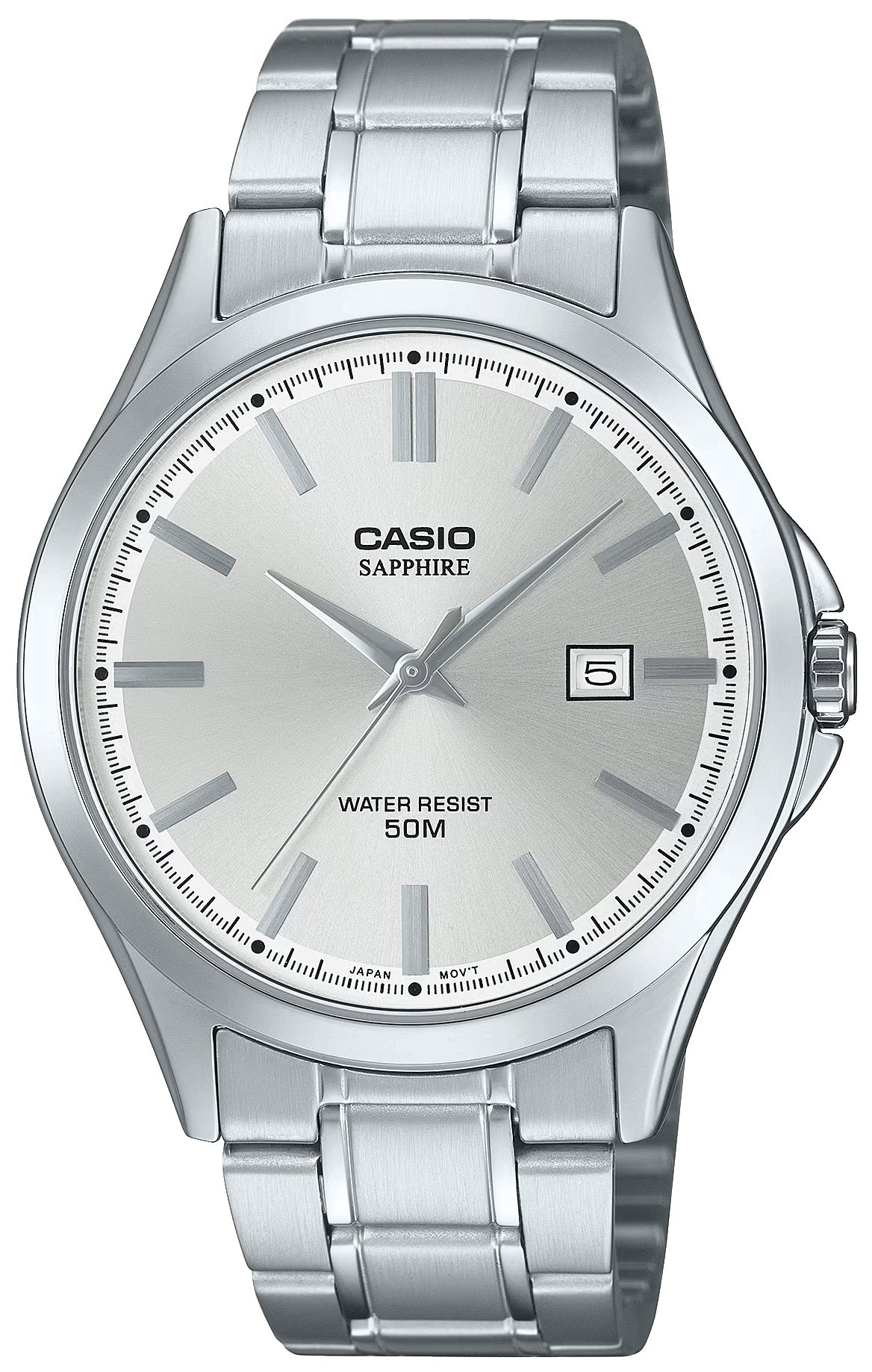 Мужские кварцевые часы с аналоговым отображением времени. Серия General Collection. Центральные часовая, минутная и секундная стрелки. Серебристый циферблат с часовыми метками в виде штрихов. Окошко даты в позиции 3 часов (значение даты меняется до 31, для месяцев, у которых количество дней меньше 31, необходимо корректировать значение вручную). Устойчивое к возникновению мелких царапин сапфировое. Круглый стальной корпус размером 47 мм на 41,3 мм, толщиной 8,8 мм. Рифлёная переводная головка с защитой. Стальной браслет с раскладывающейся застежкой. Батарейка рассчитана на 3 года. Водонепроницаемость 50WR (мытьё рук, дождь). Вес около 112 г.