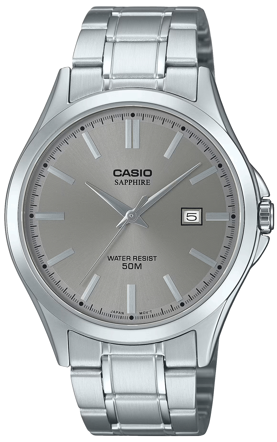Мужские кварцевые часы с аналоговым отображением времени. Серия General Collection. Центральные часовая, минутная и секундная стрелки. Серый циферблат с часовыми метками в виде штрихов. Окошко даты в позиции 3 часов (значение даты меняется до 31, для месяцев, у которых количество дней меньше 31, необходимо корректировать значение вручную). Устойчивое к возникновению мелких царапин сапфировое. Круглый стальной корпус размером 47 мм на 41,3 мм, толщиной 8,8 мм. Рифлёная переводная головка с защитой. Стальной браслет с раскладывающейся застежкой. Батарейка рассчитана на 3 года. Водонепроницаемость 50WR (мытьё рук, дождь). Вес около 112 г.