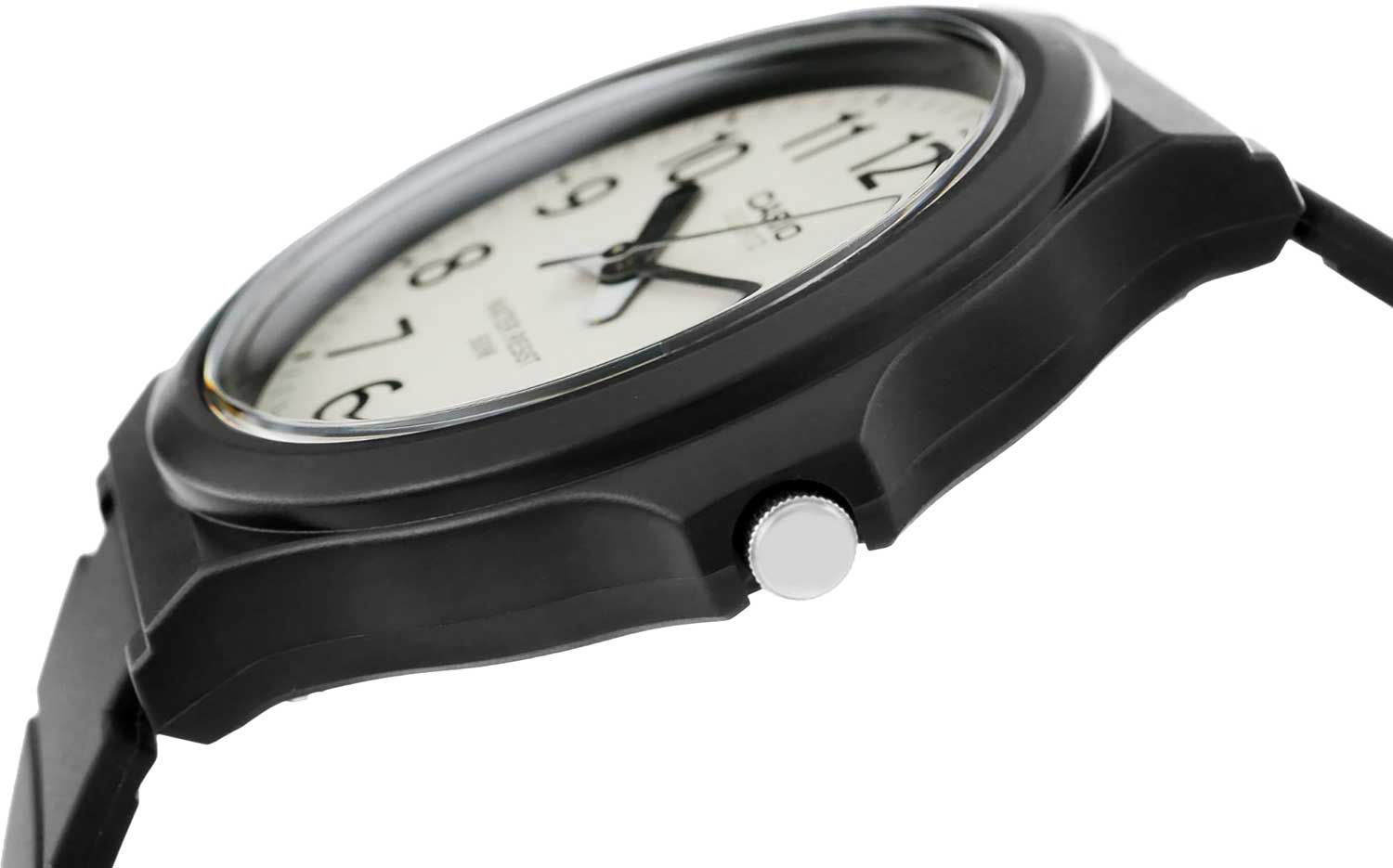 Мужские кварцевые аналоговые часы. Casio Collection. Центральные часовая, минутная и секундная стрелки. Белый циферблат с часовыми метками в виде арабских цифр. Пластиковое стекло. Круглый корпус из полимерного пластика чёрного цвета. Размер корпуса 43 мм на 48 мм, толщина 10,3 мм. Переводная головка с защитой. Чёрный пластиковый ремешок с классической застежкой buckle. Ширина ремешка 22мм, длина ремешка 200мм. Батарейка рассчитана на 3 года. Стальная задняя крышка крепится на 4-х винтах. Водонепроницаемость 50WR (мытьё рук, дождь). Вес около 35 г.
