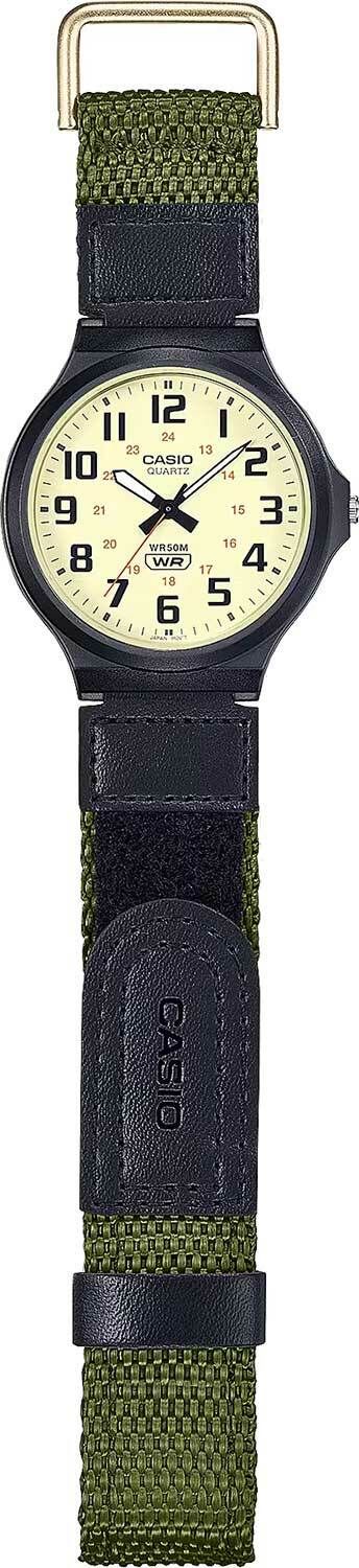 Мужские аналоговые кварцевые часы. Центральные часовая, минутная и секундная стрелки. Бежевый циферблат с часовыми метками в виде арабских цифр. Стрелки с люминесцентным покрытием, которое светится в темноте после непродолжительного нахождения на свету. 12-ти и 24-х часовой формат отображения времени. Круглый корпус из полимерного пластика чёрного цвета. Размеры корпуса 43,6 мм x 48 мм, толщина 10,3 мм. Переводная головка с защитой. Зелёный тканевый ремешок с чёрными кожаными вставками. Ремешок на липучке. Водонепроницаемость 50WR (мытьё рук, дождь). Вес около 30 г.