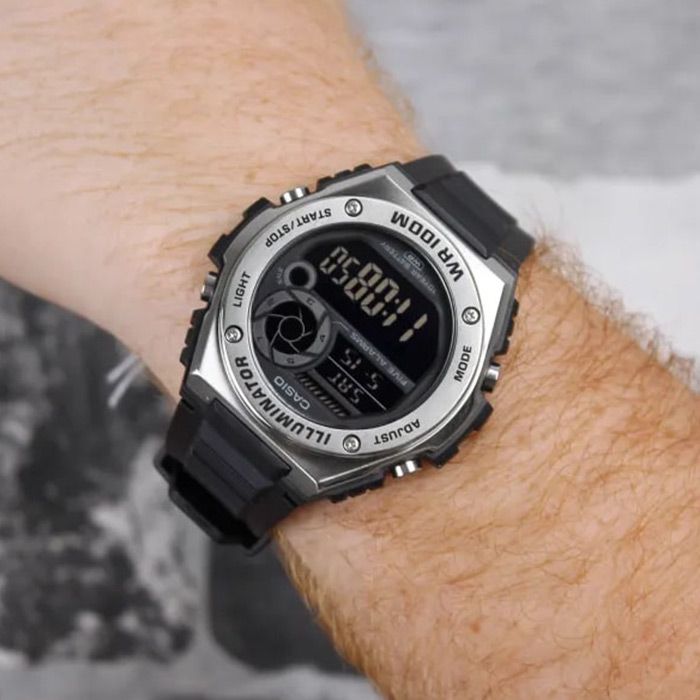 Мужские кварцевые наручные часы с цифровым отображением времени. Серия Casio Collection Standard Digital. Часы с секундомером и таймером станут незаменимым помощником при занятиях спортом. Циферблат подсвечивается светодиодом с функцией послесвечения. Цвет подсветки оранжевый. Двойное время (Dual Time) - одновременное отображение текущего времени в двух разных часовых поясах. Автоматический календарь до 2099 года. Секундомер с точностью показаний 1/100 секунды и временем измерения 24 часа. Режимы измерения: прошедшее время, промежуточное время, два финишных результата. Таймер обратного отсчета от 1минуты до 24часов с автоповтором. 12/24 -х часовой формат отображения времени. 5 ежедневных будильников, 1 с функцией повтора сигнала Snooze, ежечасный сигнал. Типы будильников: ежедневный; будильник, настроенный на определенный день; будильник, настроенный на ежедневное звучание в течение месяца; ежемесячный будильник Продолжительность звучания сигнала будильника 10 секунд. Круглый корпус из нержавеющей стали и черного пластика. Размеры корпуса 50,7 мм на 51,8мм, толщина 13,7мм. Чёрный пластиковый ремешок с классической застёжкой buckle. Батарея рассчитана на 10 лет. Водонепроницаемость 100WR (часы подходят для плавания с маской, трубкой, обычного плавания). Вес около 55 г.