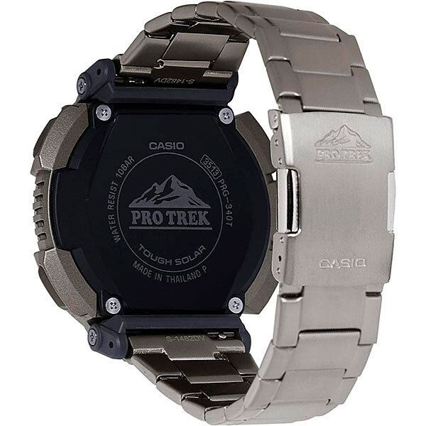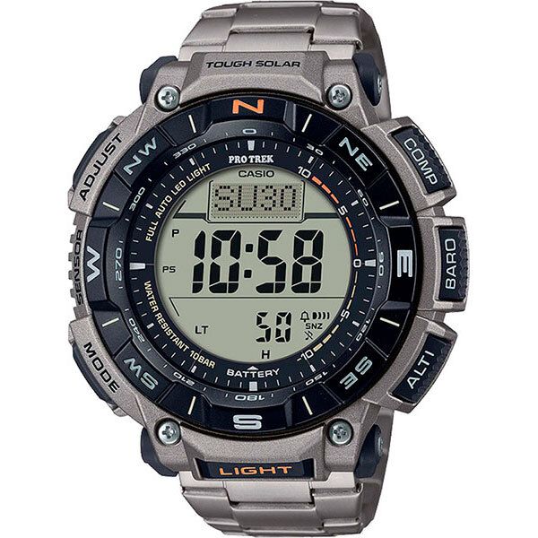 Мужские кварцевые электронные наручные часы. Серия Casio Pro-Trek. Полностью автоматическая светодиодная подсветка - поворот руки при недостаточном освещении обеспечит автоматическое включение подсветки дисплея. Питание от солнечной энергии Tough Solar - источником питания служит светочувствительная панель и аккумулятор, подзаряжаемый от солнечного света. Индикатор уровня заряда аккумулятора. Функция автоматического сохранения энергии. Время работы аккумулятора без подзарядки приблизительно 7 месяцев, при включенной функции сохранения энергии приблизительно 27 месяцев. Модуль часов рассчитан на работу при низких температурах до -10°С/14°F. Барометр (260 / 1.100 hPa) - Специальный датчик измеряет давление воздуха (диапазон измерений составляет 260 / 1100 гПа, 1 гПа = 0,75 мм рт. ст. или 1 мм рт. ст. = 1,333 гПа) и отображает измеренное значение на экране в виде символа. Термометр (-10°C / +60°C) - Датчик измеряет температуру окружающего воздуха вокруг часов и отображает ее на экране в градусах °C (-10°C /+60°C). Цифровой компас. Высотомер 10,000 м - Встроенный датчик давления определяет изменения в атмосферном давлении и преобразовывает полученные результаты в абсолютную высоту до 10 000 м. График набора высоты. Память данных высотомера . Данные о восходе/закате солнца. - После введения географического местоположения, на экране будет отображаться восход и закат солнца для любой установленной даты. Функция мирового времени: 31 часовая зона (48 городов). Секундомер с точностью показаний 1/10 секунды и пределом измерения 1000 часов. Таймер - время можно предварительно настроить от 1 минуты и до 24 часов. 5 ежедневных будильников. Функция повтора сигнала будильника. Включение/выключение звука кнопок. Автоматический календарь. 12/24- х часовой формат времени. Безель с направлениями. Дуплексный ЖК-дисплей. Корпус из полимерного пластика. Титановый браслет.