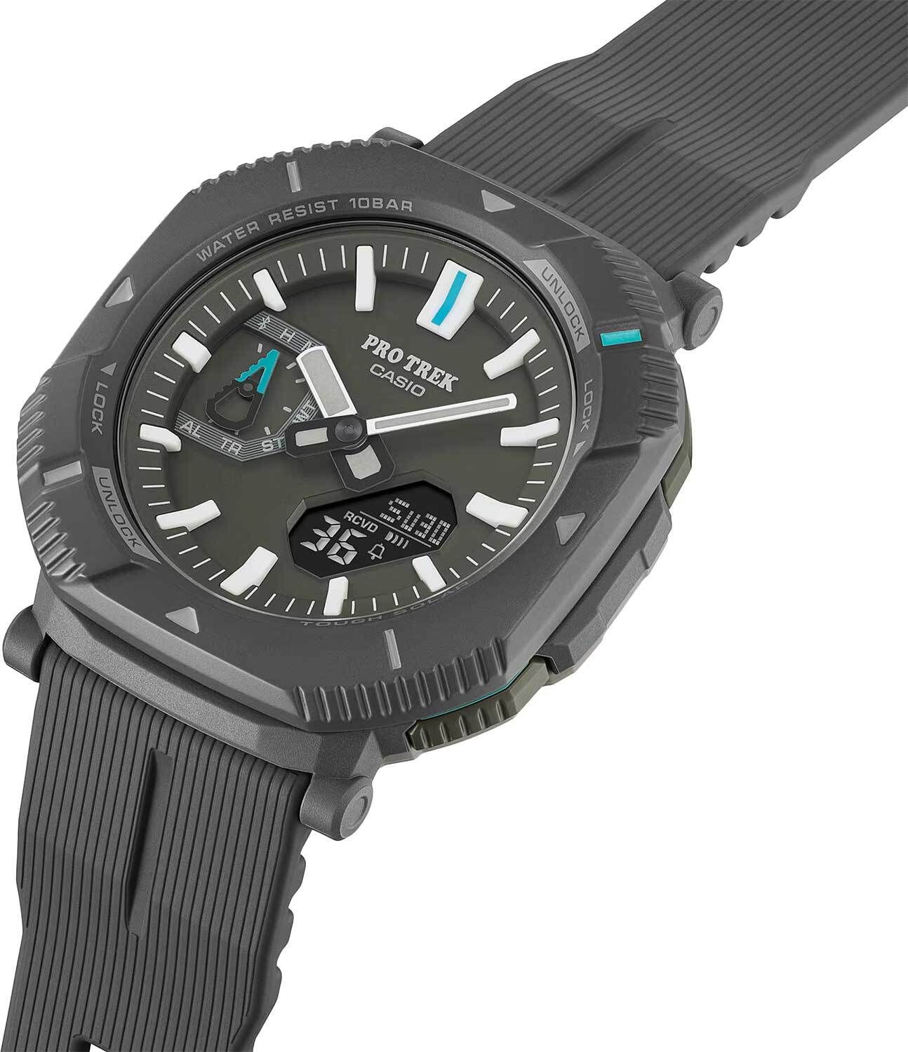 Мужские кварцевые аналого-цифровые наручные часы. Коллекция Casio ProTrek. Питание от солнечной энергии (технология Tough Solar) - источником питания служит светочувствительная панель и аккумулятор, подзаряжаемый при попадании солнечного света на циферблат часов. Индикатор уровня заряда батареи (стрелка индикатора на дополнительном малом циферблате в положении «9 часов» смоделирована по образцу карабина). Функция энергосбережения. Время работы без подзарядки в обычном режиме до 7 месяцев, в режиме энергосбережения до 18 месяцев. Часы оснащены беспроводной технологией Bluetooth® со сверхнизким потреблением энергии для синхронизации со смартфоном. При подключении к смартфону через специальное приложение, часы автоматически корректируют текущее время и получают доступ к ряду полезных функций. Двойная светодиодная подсветка Super Illuminator обеспечивает подсветку не только аналогового циферблата, но и цифрового дисплея, выбираемая продолжительность подсветки 1,5 или 3 секунды, послесвечение. Светонакопительное покрытие стрелок обеспечивает длительное послесвечение в темноте даже после кратковременного воздействия света. Часы устойчивы к низким температурам (до -10°С). Мировое время - 38 часовых зон (38 городов), всеобщее скоординированное время (UTC), возможность быстрого переключения между текущем временем и временем выбранной часовой зоны. Функция включения/отключения летнего времени. Секундомер с точностью показаний 1/100 секунды (первые 60 минут) и 1 секунда (через 60 минут) и временем измерения 24 ч. Режимы измерения: прошедшее время, время круга/промежуточное время. Таймер обратного отсчета от 1 секунды до 60 минут (1-секундное возрастание, 1-минутное возрастание). 5 ежедневных будильников, ежечасный сигнал. Автоматический календарь до 2099 года. 12/24х часовой формат отображения времени. Функция включения/отключения звука кнопок. Функция перемещения стрелок для удобного просмотра информации на цифровом экране. Функция поиска телефона. Корпус из биопластика ( изготавливается из возобновляемых органических ресурсов) чёрного цвета. Размеры корпуса 46 мм на 50,3 мм, толщина 13,6 мм. Часы оснащены поворотным защитным безелем, позволяющем переключаться между двумя различными стилями в дизайне корпуса часов: положение, закрывающее кнопки, предотвращает случайное нажатие кнопок во время прогулки или в городе; поворот безеля на 45 градусов обеспечивает легкий доступ к кнопкам. Устойчивое к возникновению мелких механических повреждений минеральное стекло. Ремешок из биополимерного пластика ( изготавливается из возобновляемых органических ресурсов) чёрного цвета с классической застёжкой buckle. Водозащищённость 100WR (плавание и ныряние без акваланга). Вес около 44г — самые легкие часы линейки ProTrek.