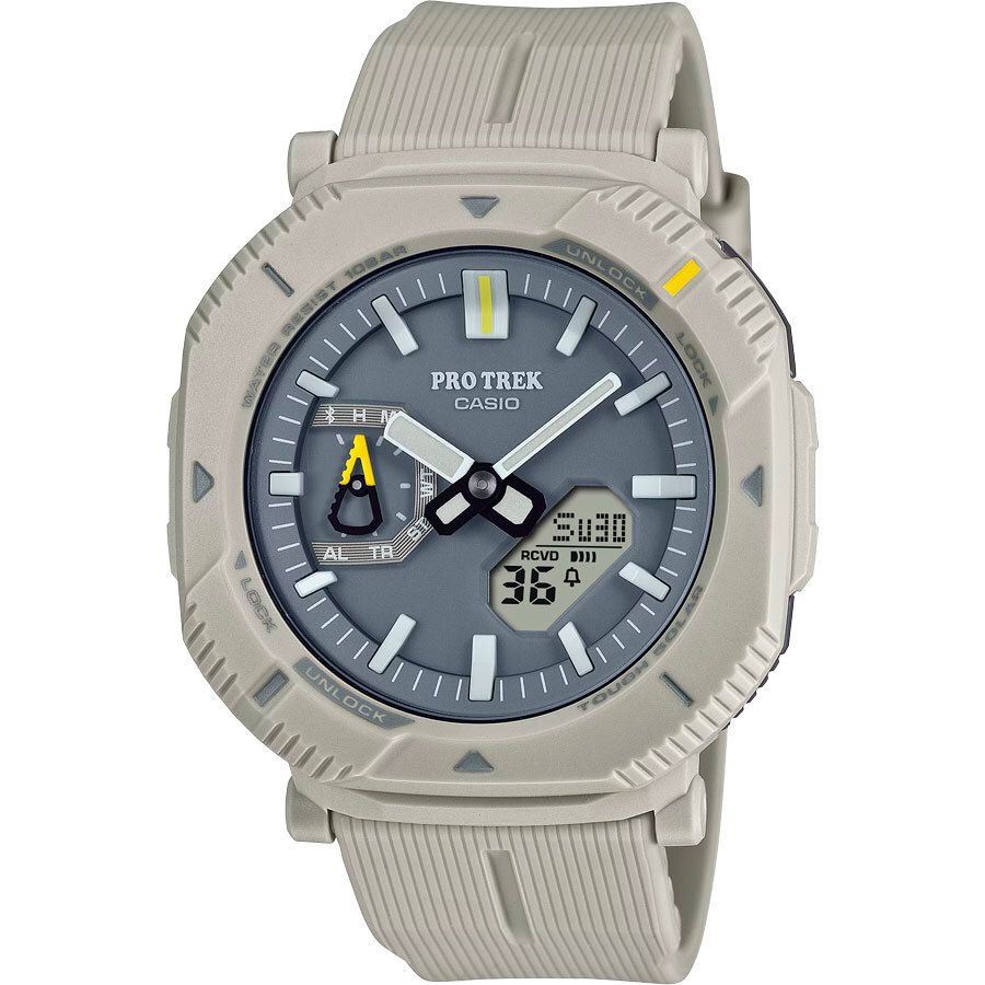Мужские кварцевые аналого-цифровые наручные часы. Коллекция Casio ProTrek. Питание от солнечной энергии (технология Tough Solar) - источником питания служит светочувствительная панель и аккумулятор, подзаряжаемый при попадании солнечного света на циферблат часов. Индикатор уровня заряда батареи (стрелка индикатора на циферблате в положении «9 часов» смоделирована по образцу карабина). Функция энергосбережения. Время работы без подзарядки в обычном режиме до 7 месяцев, в режиме энергосбережения до 18 месяцев. Часы оснащены беспроводной технологией Bluetooth® со сверхнизким потреблением энергии для синхронизации со смартфоном. При подключении к смартфону через специальное приложение, часы автоматически корректируют текущее время и получают доступ к ряду полезных функций. Двойная светодиодная подсветка Super Illuminator обеспечивает подсветку не только аналогового циферблата, но и цифрового дисплея, выбираемая продолжительность подсветки 1,5 секунды или 3 секунды, послесвечение. Светонакопительное покрытие стрелок обеспечивает длительное послесвечение в темноте даже после кратковременного воздействия света. Часы устойчивы к низким температурам (до -10°С). Мировое время - 38 часовых зон (38 городов), всеобщее скоординированное время (UTC), возможность быстрого переключения между текущем временем и временем выбранной часовой зоны. Функция включения/отключения летнего времени. Секундомер с точностью показаний 1/100 секунды (первые 60 минут) и 1 секунда (через 60 минут) и временем измерения 24 ч. Режимы измерения: прошедшее время, время круга/промежуточное время. Таймер обратного отсчета от 1 секунды до 60 минут (1-секундное возрастание, 1-минутное возрастание). 5 ежедневных будильников, ежечасный сигнал. Автоматический календарь до 2099 года. 12/24х часовой формат отображения времени. Функция включения/отключения звука кнопок. Функция перемещения стрелок для удобного просмотра ипформации на цифровом экране. Функция поиска телефона. Корпус из биополимерного пластика бежевого цвета. Размеры корпуса 46 мм на 50,3 мм, толщина 13,6 мм. Часы оснащены поворотным защитным безелем, позволяющем переключаться между двумя различными стилями в дизайне корпуса часов: положение, закрывающее кнопки, предотвращает случайное нажатие кнопок во время прогулки или в городе; поворот безеля на 45 градусов обеспечивает легкий доступ к кнопкап. Устойчивое к возникновению мелких механических повреждений минеральное стекло. Ремешок из биополимерного пластика бежевого цвета с классической застёжкой buckle. Водозащищённость 100WR (плавание и ныряние без аквалага). Вес 44г — самые легкие часы линейки ProTrek.