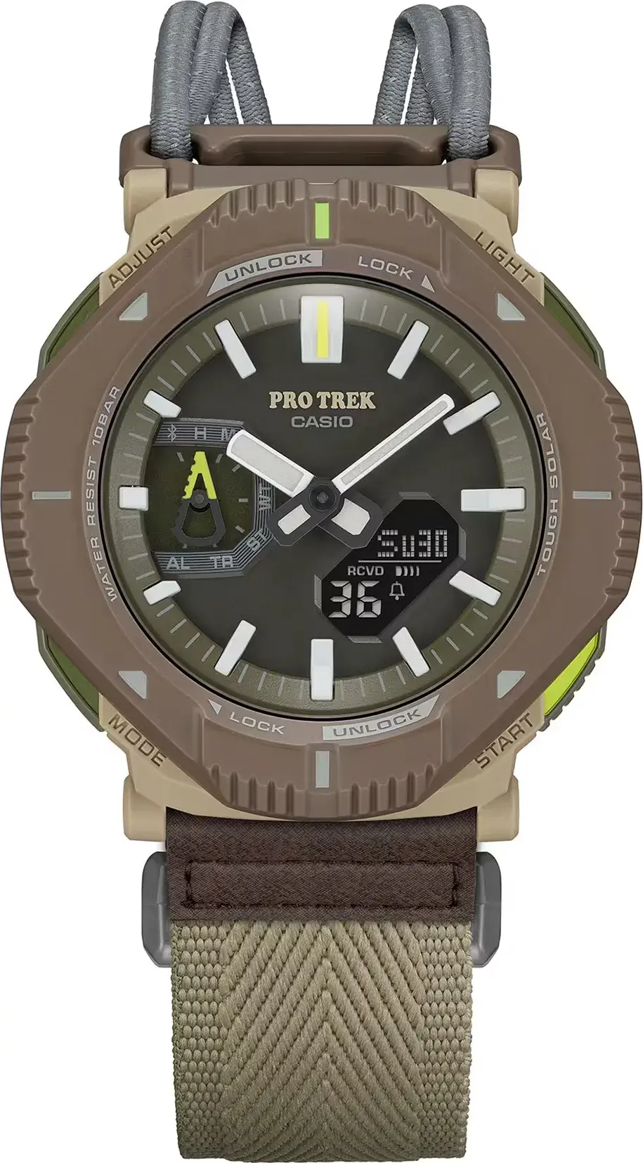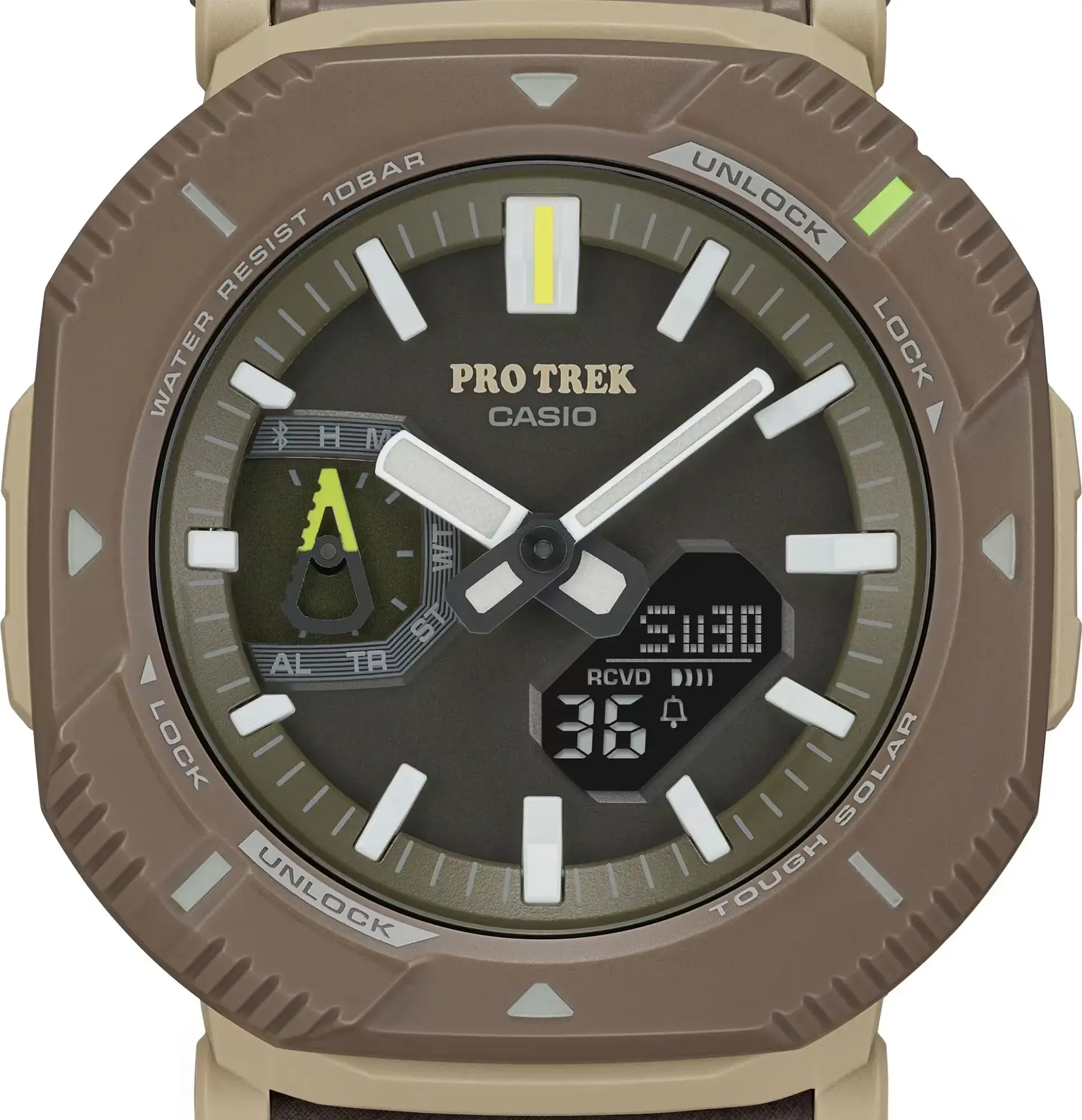 Мужские кварцевые аналого-цифровые наручные часы. Коллекция Casio ProTrek. Питание от солнечной энергии (технология Tough Solar) - источником питания служит светочувствительная панель и аккумулятор, подзаряжаемый при попадании солнечного света на циферблат часов. Индикатор уровня заряда батареи (стрелка индикатора на циферблате в положении «9 часов» смоделирована по образцу карабина). Функция энергосбережения. Время работы без подзарядки в обычном режиме до 7 месяцев, в режиме энергосбережения до 18 месяцев. Часы оснащены беспроводной технологией Bluetooth® со сверхнизким потреблением энергии для синхронизации со смартфоном. При подключении к смартфону через специальное приложение, часы автоматически корректируют текущее время и получают доступ к ряду полезных функций. Двойная светодиодная подсветка Super Illuminator обеспечивает подсветку не только аналогового циферблата, но и цифрового дисплея, выбираемая продолжительность подсветки 1,5 или 3 секунды, послесвечение. Светонакопительное покрытие стрелок обеспечивает длительное послесвечение в темноте даже после кратковременного воздействия света. Часы устойчивы к низким температурам (до -10°С). Мировое время - 38 часовых зон (38 городов), всеобщее скоординированное время (UTC), возможность быстрого переключения между текущем временем и временем выбранной часовой зоны. Функция включения/отключения летнего времени. Секундомер с точностью показаний 1/100 секунды (первые 60 минут) и 1 секунда (через 60 минут) и временем измерения 24 ч. Режимы измерения: прошедшее время, время круга/промежуточное время. Таймер обратного отсчета от 1 секунды до 60 минут (1-секундное возрастание, 1-минутное возрастание). 5 ежедневных будильников, ежечасный сигнал. Автоматический календарь до 2099 года. 12/24х часовой формат отображения времени. Функция включения/отключения звука кнопок. Функция перемещения стрелок для удобного просмотра ипформации на цифровом экране. Функция поиска телефона. Отображение дня недели на шести языках. Корпус из биополимерного пластика (изготавливается из возобновляемых органических ресурсов) коричневого цвета. Размеры корпуса 46 мм на 50,3 мм, толщина 13,6 мм. Часы оснащены поворотным защитным безелем, позволяющем переключаться между двумя различными стилями в дизайне корпуса часов: положение, закрывающее кнопки, предотвращает случайное нажатие кнопок во время прогулки или в городе; поворот безеля на 45 градусов обеспечивает легкий доступ к кнопкам. Устойчивое к возникновению мелких механических повреждений минеральное стекло. Текстильный ремешок бежевого цвета, эластичный шнур-петля серого цвета на ремешке вдохновлен снаряжением для активного отдыха. Водозащищённость 100WR (плавание и ныряние без аквалага). Вес 37г — самые легкие часы линейки ProTrek.