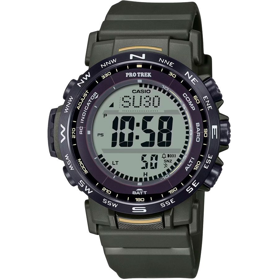 Мужские кварцевые электронные наручные часы. Серия Casio Pro-Trek. Полностью автоматическая светодиодная подсветка - поворот руки при недостаточном освещении обеспечит автоматическое включение подсветки дисплея, настройка продолжительности подсветки 1,5 или 3 с. Питание от солнечной энергии (технология Tough Solar) - источником питания служит светочувствительная панель и аккумулятор, заряжаемый при попадании солнечного света на циферблат часов. Индикатор уровня заряда аккумулятора. Функция автоматического сохранения энергии ( в темноте дисплей гаснет для экономии энергии). Время работы аккумулятора без подзарядки приблизительно 7 месяцев, при включенной функции сохранения энергии приблизительно 22 месяца. Прием радиосигнала (Wave Ceptor) для корректировки времени (автоматический прием 6 раз в день). Модуль часов рассчитан на работу при низких температурах до -10°С. Барометр - специальный датчик измеряет давление воздуха и отображает измеренное значение на экране в виде символа. Диапазон измерения и отображения 260–1100 гПа. Единица измерения: 1 гПа. Термометр - датчик измеряет температуру окружающего воздуха вокруг часов и отображает ее на экране в градусах °C (-10°C /+60°C). Цифровой компас - непрерывное измерение в течение 60 секунд; 16 направлений; угловое значение от 0° до 359°; 4 указателя направлений; калибровка (двунаправленная); коррекция угла магнитного склонения; записная книжка компаса. Высотомер (альтиметр) от –700 до 10 000 м - встроенный датчик давления определяет изменения в атмосферном давлении и преобразовывает полученные результаты в высоту до 10 000 м. График набора высоты. Память данных высотомера. Данные о восходе/закате солнца - после введения географического местоположения, на экране будет отображаться восход и закат солнца для любой установленной даты. Мировое время: 31 часовая зона (48 городов), всемирное координированное время (UTC), включение/отключение летнего времени. Секундомер с точностью показаний 1/10 секунды и временем измерения 1000 часов. Режимы измерения: прошедшее время, промежуточное время, два финишных результата. Таймер обратного отсчета от 1 минуты до 24 часов. 5 ежедневных будильников (1 с повтором сигнала) , почасовой сигнал времени. Включение/выключение звука кнопок. Автоматический календарь до 2099 года. 12/24- х часовой формат отображения времени. Круглый корпус из биопластика (изготавливается из возобновляемых органических ресурсов). Размер корпуса 51,2 мм на 44,6 мм, толщина 13 мм. Устойчивое к мелким механическим повреждениям минеральное стекло. Зелёный ремешок из биопластика (изготавливается из возобновляемых органических ресурсов), классическая застежка buckle. Водонепроницаемость 100WR (плавание и погружение без акваланга). Вес около 45 г.
