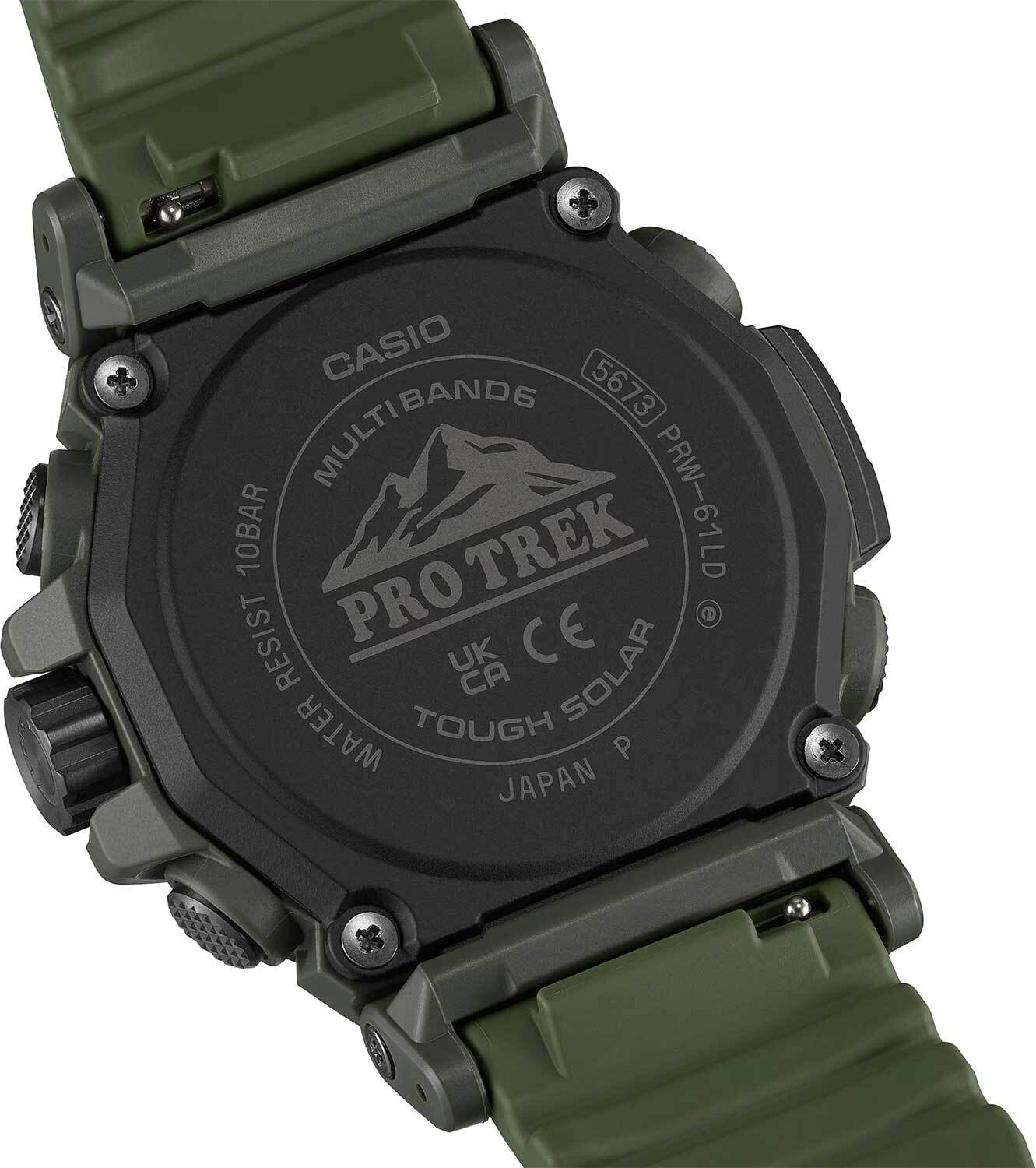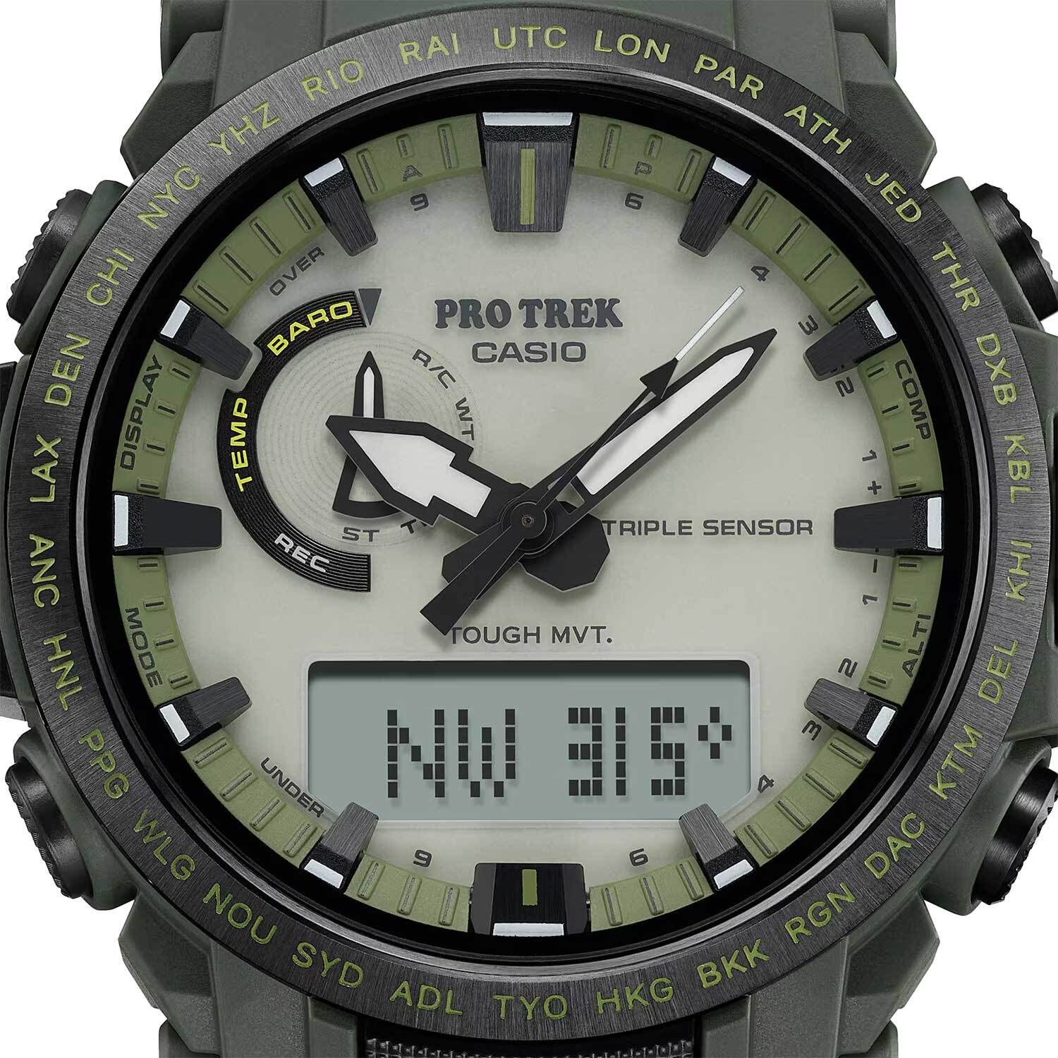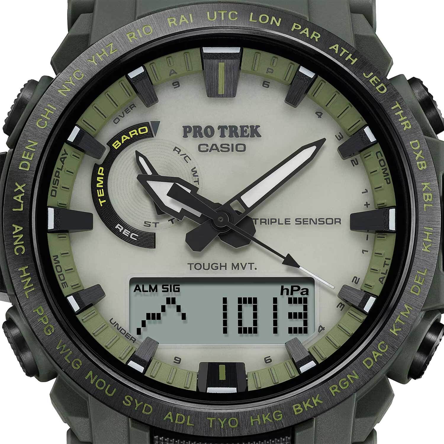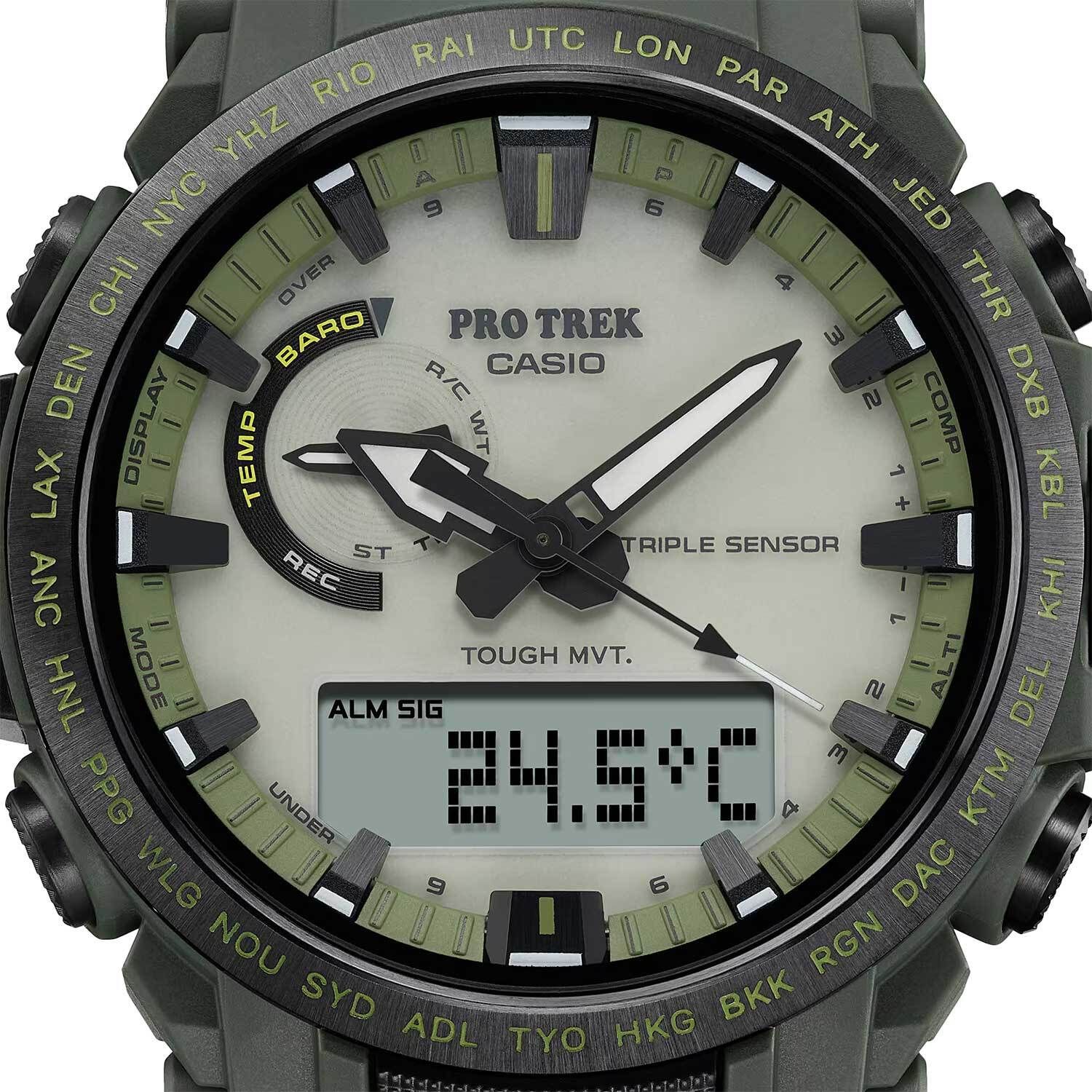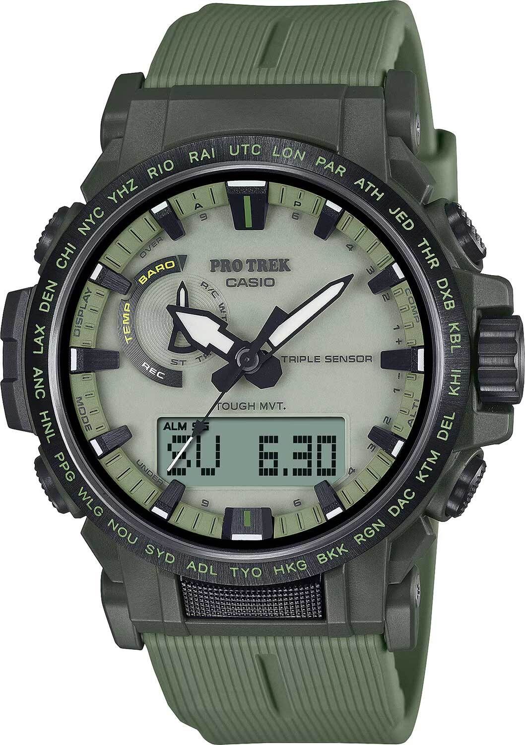 Мужские кварцевые аналого-цифровые наручные часы на солнечной батарее. Серия Casio Pro Trek. Особенностью модели является светлый фосфоресцентный циферблат, светящийся в темноте и обеспечивающий улучшенную видимость. Полностью автоматическая светодиодная подсветка - поворот руки при недостаточном освещении обеспечит автоматическое включение подсветки дисплея. Настраиваемое послесвечение 1,5 или 3секунды. Цвет подсветки белый. Светящееся покрытие стрелок и циферблата обеспечивает длительное послесвечение в темноте после кратковременного воздействия света. Питание от солнечной энергии (технология Tough Solar) - источником питания служит светочувствительная панель и аккумулятор, заряжаемый при попадании солнечного света на циферблат часов. Индикатор уровня заряда батареи. Функция автоматического сохранения энергии (в темноте дисплей гаснет и стрелки останавливаются для экономии энергии). Технология Multi Band 6 позволяет принимать сигналы от шести радиовышек, расположенных в различных точках земного шара (Европа, США, Япония, Китай), которые передают временные сигналы от определенных атомных часов для корректировки текущего времени. Технология Triple Sensor позволяет определять сторону света, температуру и атмосферное давление. Барометр (260 / 1.100 hPa) - специальный датчик измеряет давление воздуха и отображает измеренное значение на экране в виде символа. Термометр (-10°C / +60°C) - датчик измеряет температуру окружающего воздуха вокруг часов и отображает ее на экране в градусах °C . Цифровой компас измеряет и отображает направление в виде одной из 16 точек. Диапазон измерения: от 0 до 359° с разрешением 1°. Стрелочная индикация севера. Коррекция магнитного склонения. Альтиметр (высотомер) - диапазон измерения от -700 до 10 000 м - встроенный датчик давления определяет изменения в атмосферном давлении и преобразовывает полученные результаты в абсолютную высоту до 10 000 м. График набора высоты. Память данных высотомера - можно сохранить до 40 записей о высотных точках рельефа местности. Мировое время - 29 городов (29 часовых поясов), всемирное координированное время (UTC), функция включения/отключения летнего времени, переключение между домашним и мировым временем. Секундомер с точностью измерения 1/10 секунды и временем измерения 24 часа. Режимы измерения: прошедшее время, промежуточное время, два финишных результата. Таймер обратного отсчёта от 1 минуты до 1 часа с автоповтором. 5 ежедневных будильников, сигнал начала часа. Функция автоматической коррекции положения стрелок проверяет положение стрелок каждый час и корректирует его в случае необходимости. Включение/выключение звука кнопок. Функция перемещения стрелок для удобного просмотра информации на цифровом дисплее. Система Smart Access с помощью переводной головки обеспечивает простой и удобный доступ ко всем важным функциям часов - нажатие или поворот переводной головки позволяет переключаться между различными режимами и активировать будильник, таймер, секундомер, а также настраивать функцию мирового времени. Автоматический календарь до 2099 года. 12/24-х часовой формат отображения времени. Часы устойчивы к низким температурам (-10 °C). Круглый корпус из биопластика (изготавливается из возобновляемых органических ресурсов) зелёного цвета. Стальной безель с черным IP покрытием. Габаритные размеры корпуса 47,4