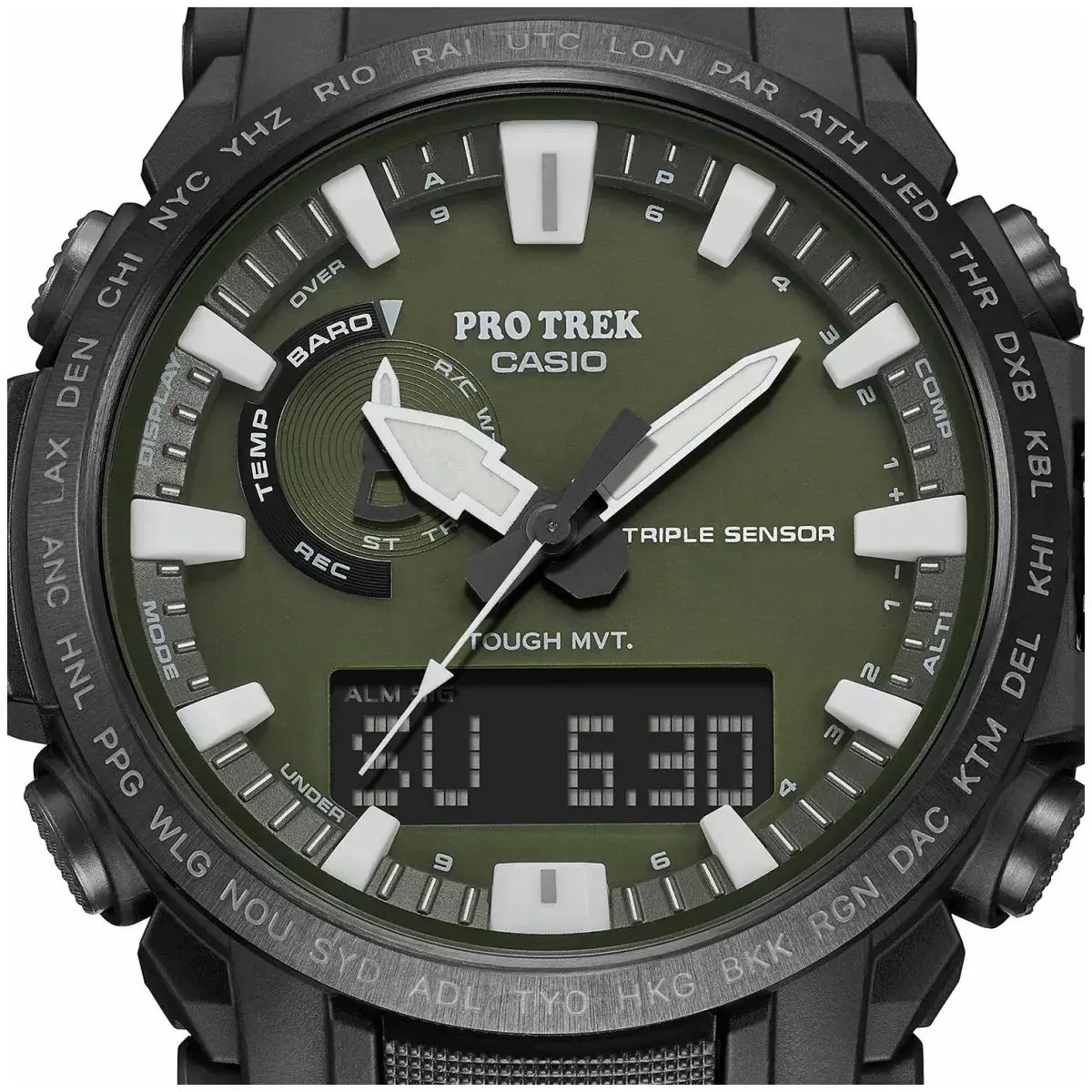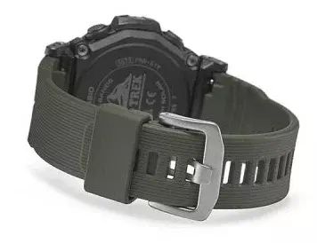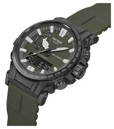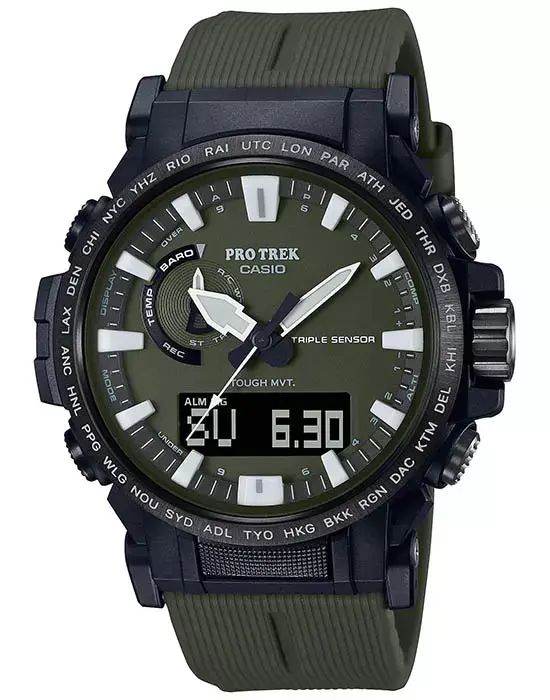 Мужские кварцевые аналогово-цифровые наручные часы. Серия Casio Pro Trek. Полностью автоматическая светодиодная подсветка - поворот руки при недостаточном освещении обеспечит автоматическое включение подсветки дисплея. Неоновый дисплей - светящееся покрытие обеспечивает длительную подсветку в темное время суток после короткого воздействия света. Питание от солнечной энергии Tough Solar - источником питания служит светочувствительная панель и аккумулятор, подзаряжаемый от солнечного света. Индикатор заряда батареи. Функция автоматического сохранения энергии. Функция энергосбережения (дисплей гаснет и стрелки останавливаются для экономии энергии, когда часы остаются в темноте). Прием радиосигнала (Европа, США, Япония, Китай) для корректировки текущего времени. Барометр (260 / 1.100 hPa) - специальный датчик измеряет давление воздуха (диапазон измерений составляет 260 / 1100 гПа, 1 гПа = 0,75 мм рт ст или 1 мм рт ст = 1,333 гПа) и отображает измеренное значение на экране в виде символа. Термометр (-10°C / +60°C) - датчик измеряет температуру окружающего воздуха вокруг часов и отображает ее на экране в градусах °C (-10°C +60°C). Цифровой компас. Альтиметр (высотомер) 10 000 м - встроенный датчик давления определяет изменения в атмосферном давлении и преобразовывает полученные результаты в абсолютную высоту до 10 000 м. График набора высоты. Память данных высотомера - можно сохранить до 40 записей о высотных точках рельефа местности. Функция мирового времени - 48 городов (31 часовой пояс), летнее/стандартное время, быстрая замена текущего времени на мировое. Функция секундомера с точностью измерений 1/100 секунды и пределом измерения 24 часа. Таймер обратного отсчёта - время можно предварительно настроить от 1 минуты и до 1 часа. Часы могут затем автоматически начать отсчет в обратную сторону в установленное время. 5 ежедневных будильников. Функция автоматической коррекции положения стрелок проверяет положение стрелок каждый час и корректирует его в случае необходимости. Включение/выключение звука кнопок. Функция перемещения стрелок. Система Smart Access с помощью переводной головки обеспечивает простой и удобный доступ ко всем важным функциям часов - нажатие или поворот переводной головки позволяет переключаться между различными режимами и активировать будильник, таймер, секундомер, а также настраивать функцию мирового времени. Автоматический календарь. 12/24-х часовой формат времени. Корпус устойчивый к низким температурам (-10 °C). Круглый корпус из полимерного пластика, стальной безель с покрытием. Переводная головка с защитой. Ремешок из полимерного пластика.