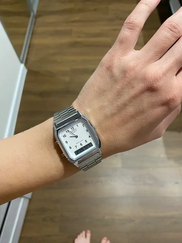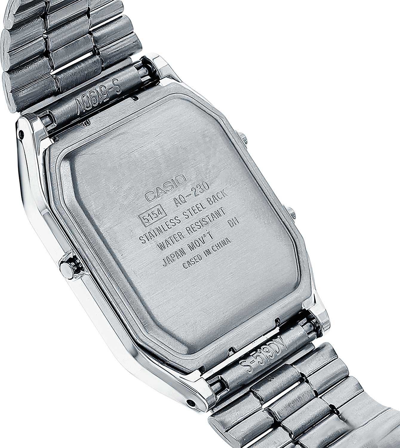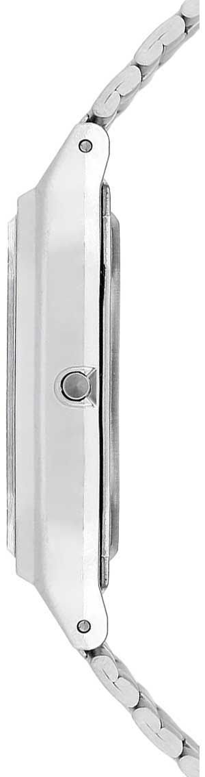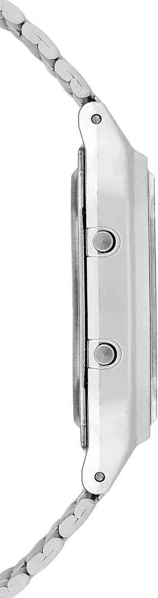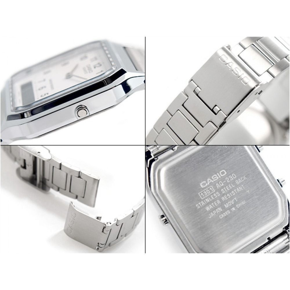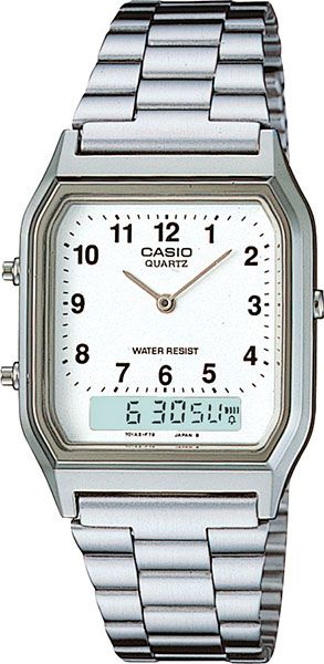 Аналого-цифровые кварцевые наручные часы. Коллекция Casio Vintage. Унисекс часы. Центральные часовая и минутная стрелки. Белый циферблат с часовыми метками в виде арабских цифр. Второй часовой пояс. Двойное время. Одновременное отображение текущего времени в двух разных часовых поясах. Секундомер с точностью показаний 1/100с и временем измерения 1ч. 12-ти и 24-х часовой формат отображения времени. Ежедневный будильник, индикация начала часа. Автоматический календарь с установкой 28 дней на февраль. Прямоугольный корпус из полимерного пластика серебристого цвета. Размеры корпуса 27,8 мм на 38,8 мм, толщина 8,1 мм. Пластиковое стекло. Браслет из нержавеющей стали с раскладывающейся застежкой. Срок службы батареи около 3-х лет. Водонепроницаемость WR30 (защита от брызг). Вес около 47 г.