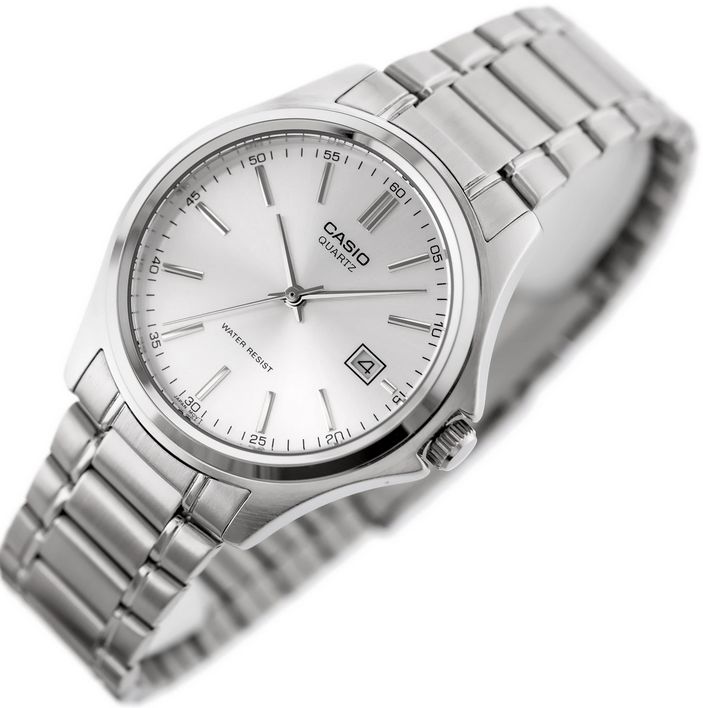 Мужские кварцевые часы с аналоговым отображение времени. Серия Casio Collection. Центральные часовая, минутная и секундная стрелки. Серебристый циферблат с часовыми метками в виде штрихов. Минутная шкала на циферблате. Окошко даты в позиции 3 часов. Устойчивое к мелким механическим повреждениям минеральное стекло. Круглый корпус из гипоаллергенной латуни размером 42 мм на 38,5 мм, толщиной 8,7 мм. Переводная головка с защитой. Стальной браслет с тройной раскладывающейся застежкой. Ширина браслета 20 мм. Батарея рассчитана на 2 года. Водонепроницаемость 30WR (защита от брызг). Вес около 87 г.