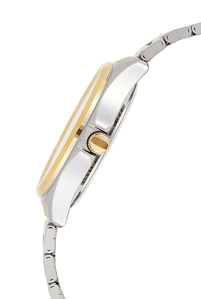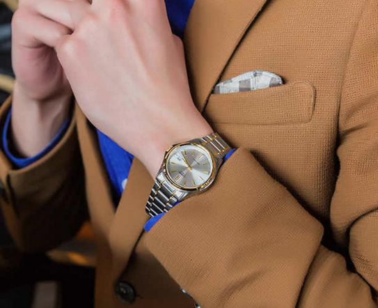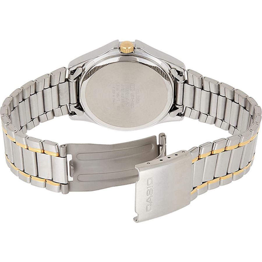 Мужские кварцевые часы с аналоговым отображение времени. Серия Casio Collection. Центральные часовая, минутная и секундная стрелки золотистого цвета. Серебристый циферблат с часовыми метками в виде штрихов. Минутная шкала на циферблате. Окошко даты в позиции 3 часов. Устойчивое к мелким механическим повреждениям минеральное стекло. Круглый корпус из гипоаллергенной латуни размером 42 мм на 38,5 мм, толщиной 8,7 мм. Безель золотистого цвета. Переводная головка с защитой. Стальной браслет с частичным IP покрытием цвета жёлтого золота, тройная раскладывающаяся застежка. Ширина браслета 20 мм. Батарея рассчитана на 2 года. Водонепроницаемость 30WR (защита от брызг). Вес около 87 г.