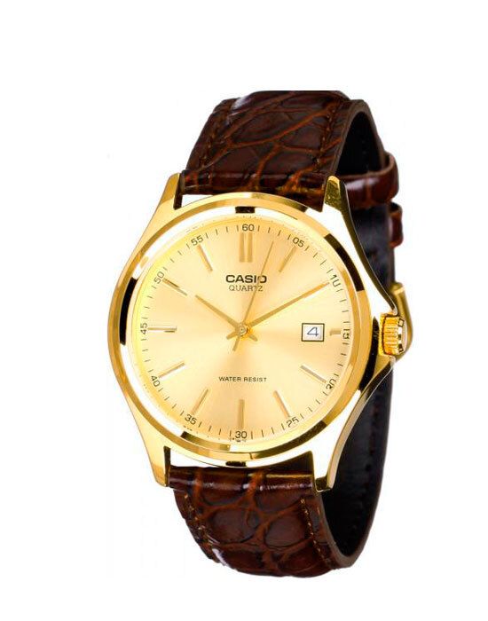 Мужские кварцевые аналоговые наручные часы. Серия Casio Collection. Центральные часовая, минутная и секундная стрелки. Золотистый циферблат с часовыми метками в виде штрихов. Минутная шкала на циферблате. Индикация даты в позиции 3 часов. Устойчивое к мелким механическим повреждениям минеральное стекло. Круглый корпус с IP покрытием цвета жёлтого золота. Размер корпуса 42 мм на 38,5мм, толщина 8,7 мм. Переводная головка с защитой. Коричневый кожаный ремешок с классической застежкой buckle. Водонепроницаемость 30WR (защита от брызг). Вес около 45 г.