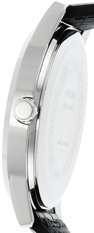 Мужские кварцевые часы с аналоговым отображение времени. Серия Casio Collection. Центральные часовая, минутная и секундная стрелки. Белый циферблат с часовыми метками в виде арабских цифр. Стрелки с люминесцентным покрытием, которое светится в темноте после непродолжительного воздействия света. Устойчивое к мелким механическим повреждениям минеральное стекло. Круглый корпус из гипоаллергенной латуни серебристого цвета. Размер корпуса 40 мм на 47 мм, толщина 8.1 мм. Рифлёная переводная головка в позиции 3 ч. Чёрный кожаный ремешок с классической застежкой buckle. Батарейка рассчитана на 3 года. Водонепроницаемость 50WR (мытьё рук, дождь). Вес около 60 г.