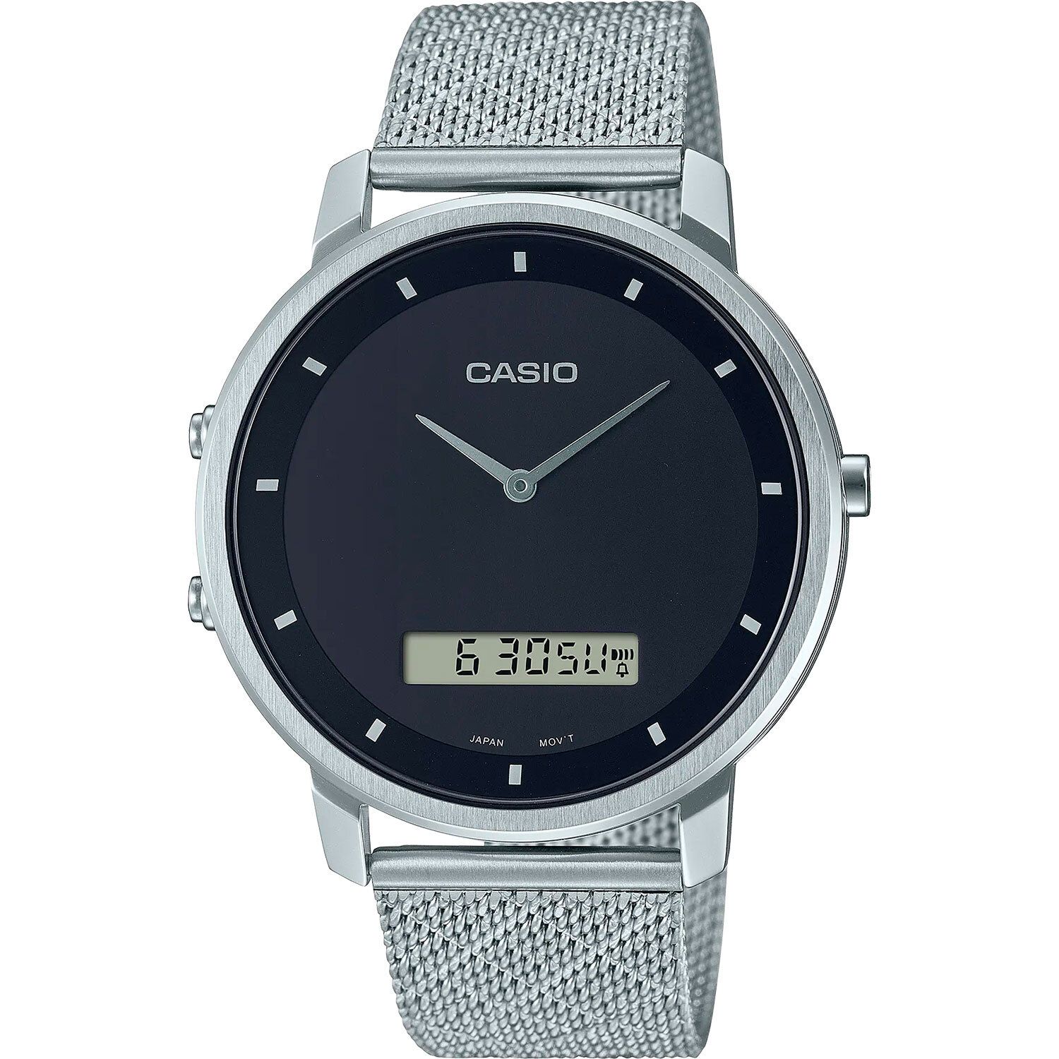 Мужские кварцевые часы. Центральные часовая и минутная стрелки. Черный циферблат. Цифровой циферблат - отображение даты, второй часовой пояс, будильник, ежечасный сигнал, секундомер. 12/24х часовой формат времени. Круглый корпус выполнен из нержавеющей стали. Диаметр корпуса составляет 41 мм, толщина 8,8 мм. Стальной браслет выполнен в технике миланского плетения, раскладная застежка. Прочное минеральное стекло устойчивое к мелким механическим повреждениям. Водостойкость WR 30 (брызги). Вес примерно 82 гр.