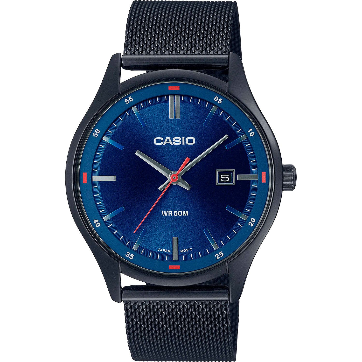 Мужские кварцевые часы. Центральные часовая, минутная и секундная стрелки. Апертура даты в позиции 3 часов. Синий циферблат. Круглый корпус выполнен из нержавеющей стали с черным IP покрытием. Диаметр корпуса составляет 40 мм, толщина 8,1 мм. Стальной браслет с покрытием выполнен в технике миланского плетения, раскладная застежка. Прочное минеральное стекло устойчивое к мелким механическим повреждениям. Водостойкость WR 50 (мытье рук, дождь). Вес примерно 76 гр.