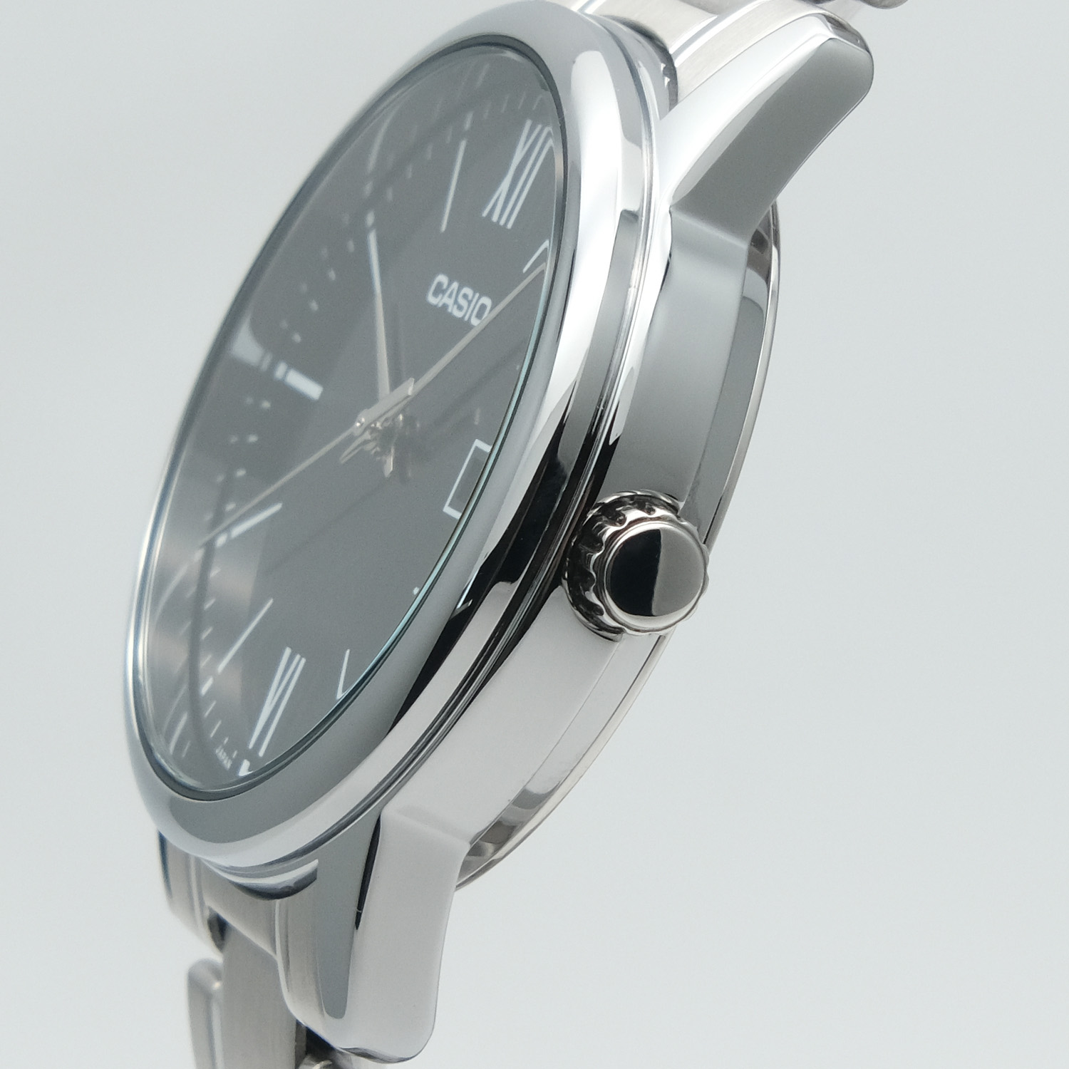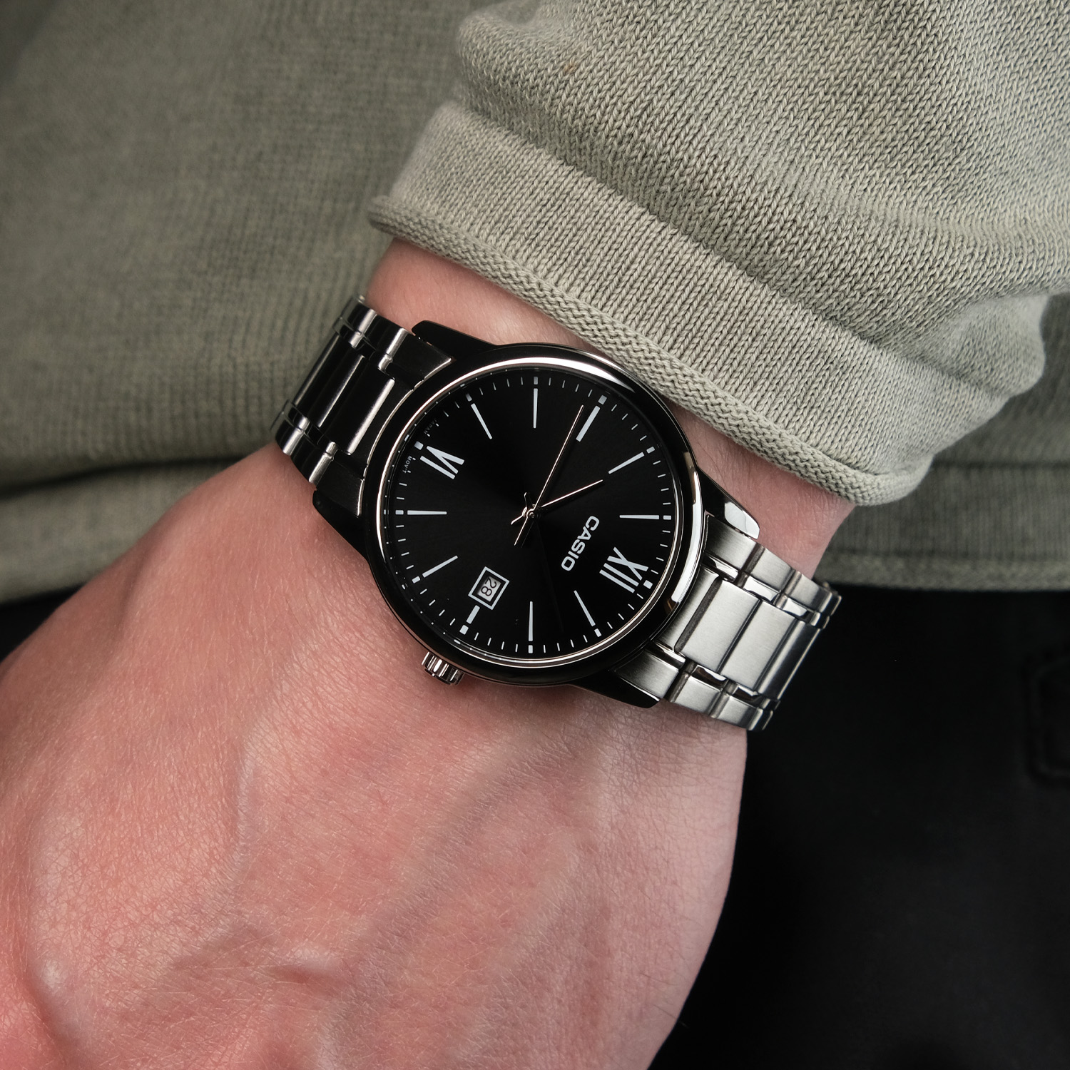 Мужские кварцевые наручные часы с аналоговым отображением времени (стрелочные). Серия Casio Classic Collection. Практичные и удобные часы для повседневного использования. Центральные часовая, минутная и секундная стрелки серебристого цвета. Чёрный циферблат с часовыми метками в виде серебристых штрихов и двух римских цифр XII и VI. Индикация даты в положении 3 часов (значение даты меняется до 31, для месяцев, у которых количество дней меньше 31, необходимо корректировать значение вручную). Устойчивое к мелким механическим повреждениям минеральное стекло. Круглый корпус из гипоаллергенной латуни золотистого цвета. Размер корпуса 37 мм на 44 мм, толщина 9.6 мм. Рифлёная переводная головка в позиции 3 часов. Стальной браслет с тройной раскладывающейся застежкой. Батарейка рассчитана на 3 года. Водонепроницаемость 30WR (защита от брызг). Вес около 93 г.