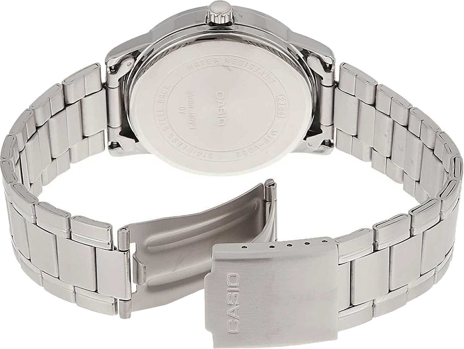 Мужские кварцевые наручные часы с аналоговым отображением времени (стрелочные). Серия Casio Collection. Центральные часовая, минутная и секундная стрелки. Белый циферблат с часовыми метками в виде штрихов и двух римских цифр VI и XII. Индикация даты в положении 3 часов. Рифленая переводная головка. Круглый корпус серебристого цвета размером 37 мм на 44 мм, толщиной 9.6 мм. Устойчивое к мелким механическим повреждениям минеральное стекло. Стальной браслет с тройной раскладывающейся застежкой. Батарейка рассчитана на 3 года. Водонепроницаемость WR30 (защита от брызг). Вес около 93 г.