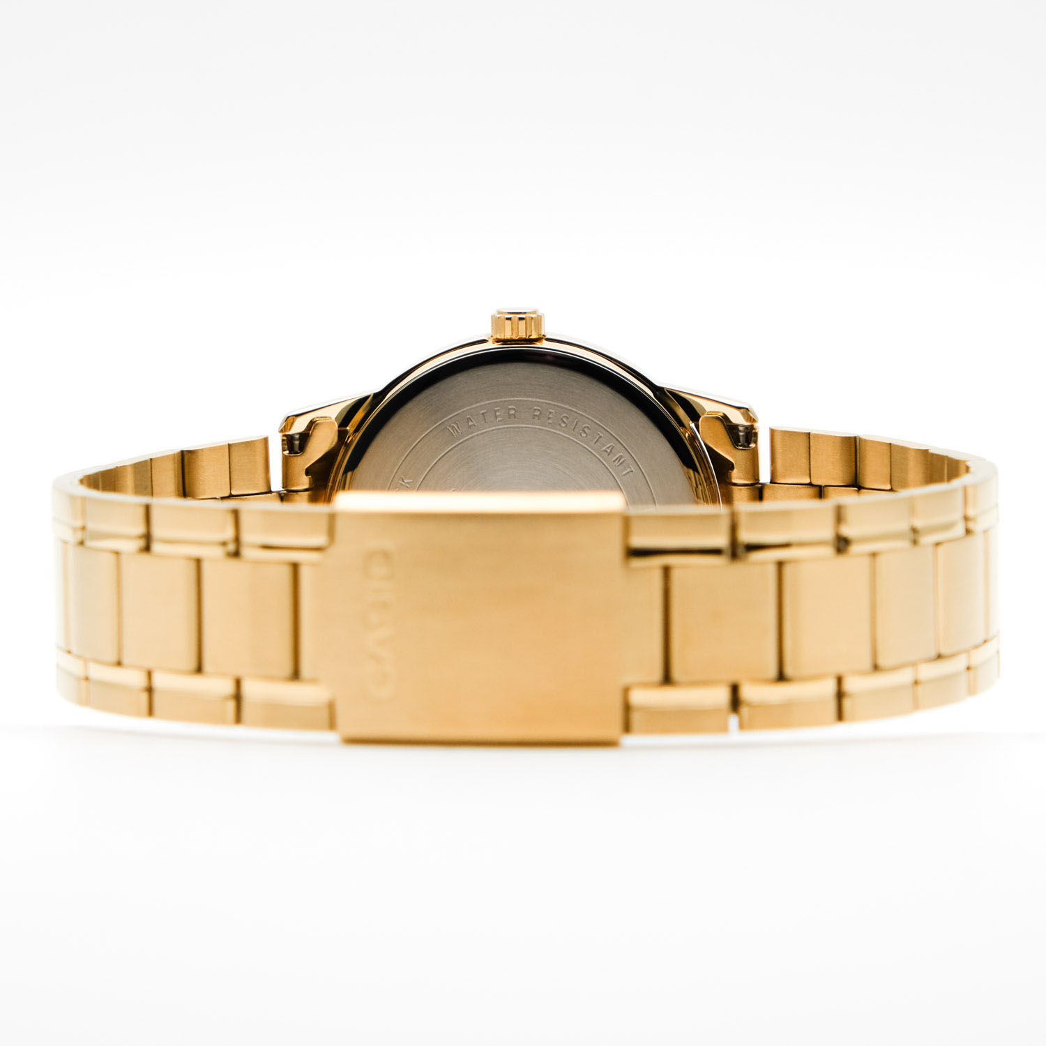 Мужские кварцевые наручные часы с аналоговым отображением времени (стрелочные). Серия Casio Classic Collection. Практичные и удобные часы для повседневного использования. Центральные часовая, минутная и секундная стрелки золотистого цвета. Белый циферблат с часовыми метками в виде арабских цифр. Индикация даты в положении 3 часов. Устойчивое к мелким механическим повреждениям минеральное стекло. Круглый корпус из гипоаллергенной латуни золотистого цвета. Размер корпуса 37 мм на 44 мм, толщина 9.6 мм. Рифлёная переводная головка в позиции 3 часов. Стальной браслет с IP покрытием цвета розового золота, тройная раскладывающаяся застежка. Батарейка рассчитана на 3 года. Водонепроницаемость 30WR (защита от брызг). Вес около 93 г.
