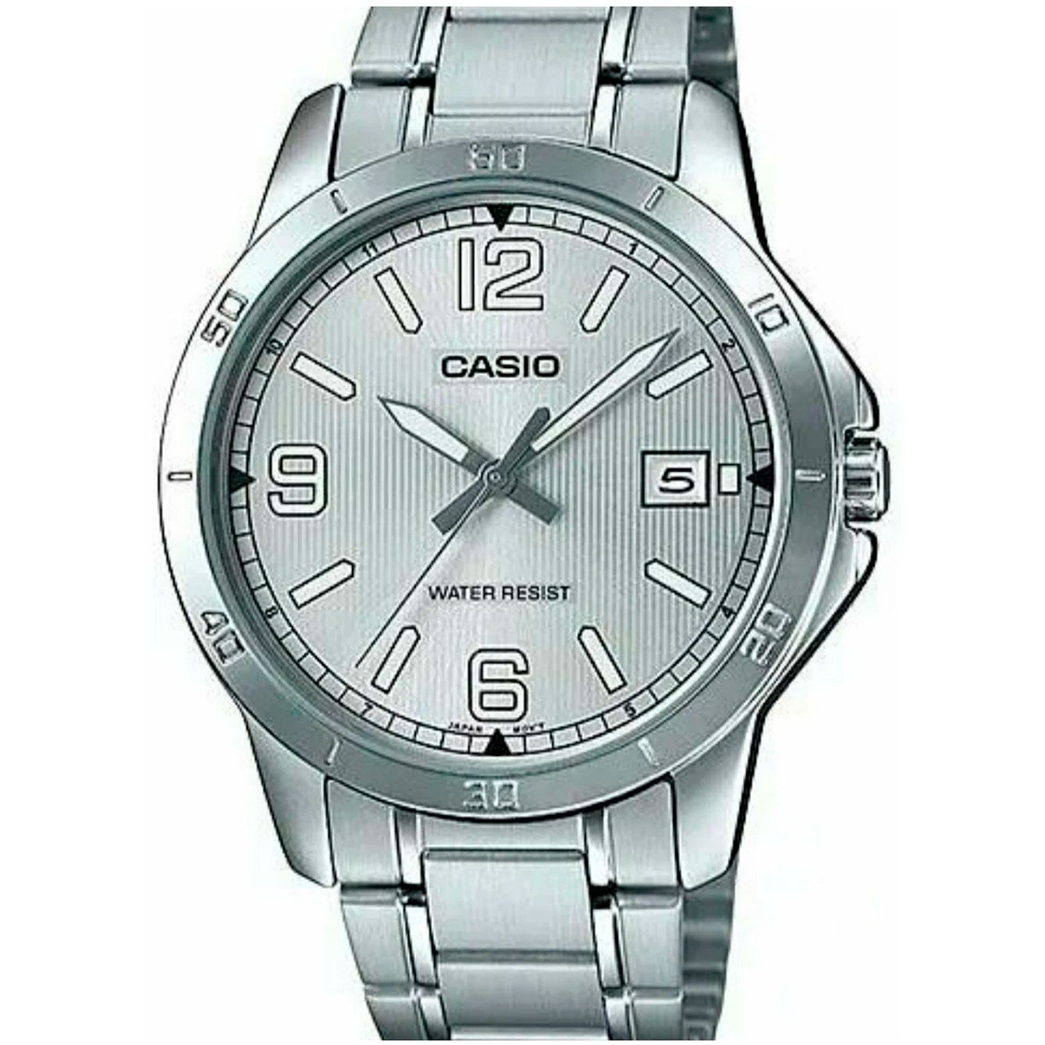 Мужские аналоговые кварцевые наручные часы. Серия Casio Collection. Центральные часовая, минутная и секундная стрелки. Серебристый циферблат с часовыми метками в виде штрихов и трёх арабских цифр. Стрелки и метки с люминесцентным покрытием, которое светится в темноте после непродолжительного воздействия света. Апертура даты в позиции 3 ч. Рифленая переводная головка с защитой. Круглый корпус серебристого цвета. Минутная шкала на безеле. Размеры корпуса 41.5 мм на 47 мм, толщина 8.3 мм. Устойчивое к мелким механическим повреждениям минеральное стекло. Браслет из нержавеющей стали с тройной раскладывающейся застежкой. Батарейка рассчитана на 3 года. Водонепроницаемость WR30 (защита от брызг). Вес около 96 г.