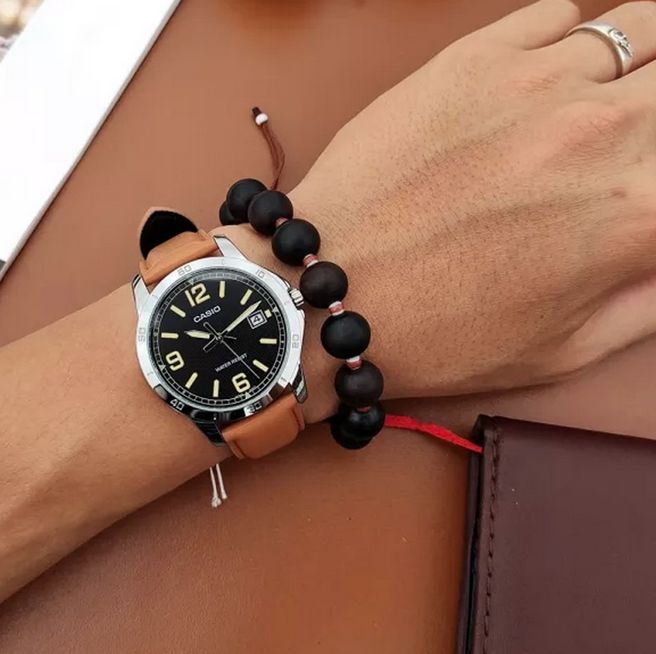 Мужские кварцевые аналоговые наручные часы. Серия Casio Collection. Центральные часовая, минутная и секундная стрелки. Чёрный циферблат с часовыми метками в виде штрихов и трёх арабских цифр. Стрелки и метки с люминесцентным покрытием, которое светится в темноте после непродолжительного воздействия света. Окошко даты в положении 3 ч. Устойчивое к мелким механическим повреждениям минеральное стекло. Круглый корпус серебристого цвета. Минутная шкала на безеле. Размер корпуса 41.5 мм на 47 мм, толщина 8.3 мм. Рифлёная переводная головка с защитой. Коричневый кожаный ремешок с классической застежкой buckle. Ширина ремешка 20мм, длина ремешка 205мм. Батарейка рассчитана на 3 года. Водонепроницаемость 30WR (защита от брызг). Вес около 51 г.