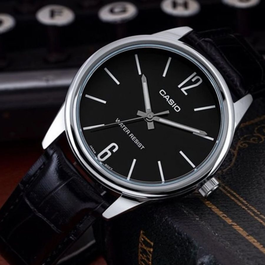 Мужские кварцевые аналоговые наручные часы. Серия Casio Collection. Центральные часовая, минутная и секундная стрелки. Чёрный циферблат с часовыми метками в виде штрихов и двух арабских цифр 6 и 12. Стрелки с люминесцентным покрытием, которое светится в темноте после непродолжительного воздействия света. Рифленая переводная головка. Круглый корпус серебристого цвета размером 47 мм на 40 мм, толщиной 8.1 мм. Устойчивое к мелким механическим повреждениям минеральное стекло. Чёрный кожаный ремешок с классической застежкой buckle. Батарейка рассчитана на 3 года. Водонепроницаемость WR30 (защита от брызг). Вес около 46 г.