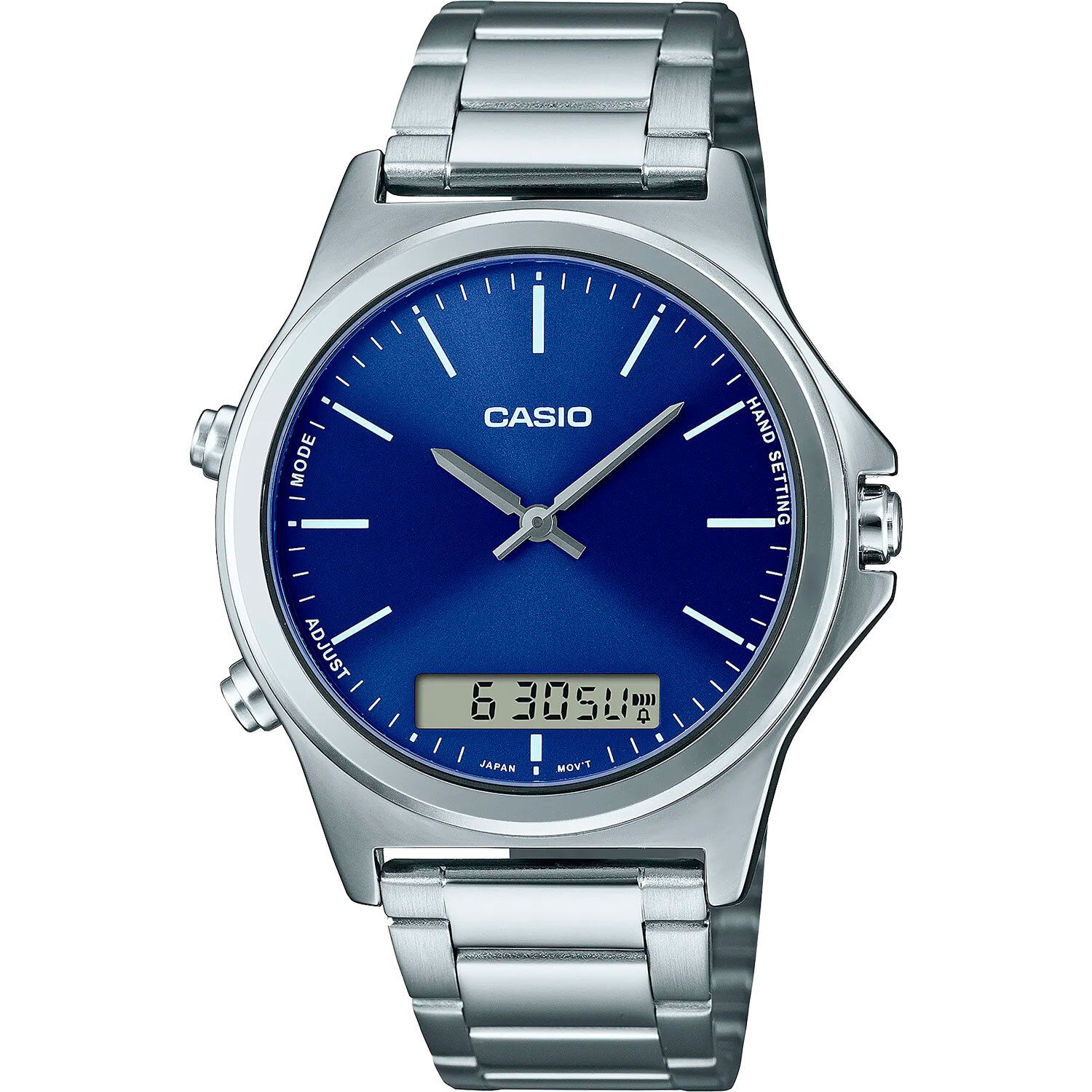 Мужские кварцевые часы. Центральные часовая и минутная стрелки. Синий циферблат. Цифровой циферблат - отображение даты, второй часовой пояс, будильник, ежечасный сигнал, секундомер. 12/24х часовой формат времени. Круглый корпус выполнен из нержавеющей стали. Диаметр корпуса составляет 41,6 мм, толщина 8,9 мм. Заводная головка с защитой. Стальной браслет, раскладывающаяся застежка. Прочное минеральное стекло устойчивое к мелким механическим повреждениям. Водостойкость WR 30 (брызги). Вес примерно 95 гр.