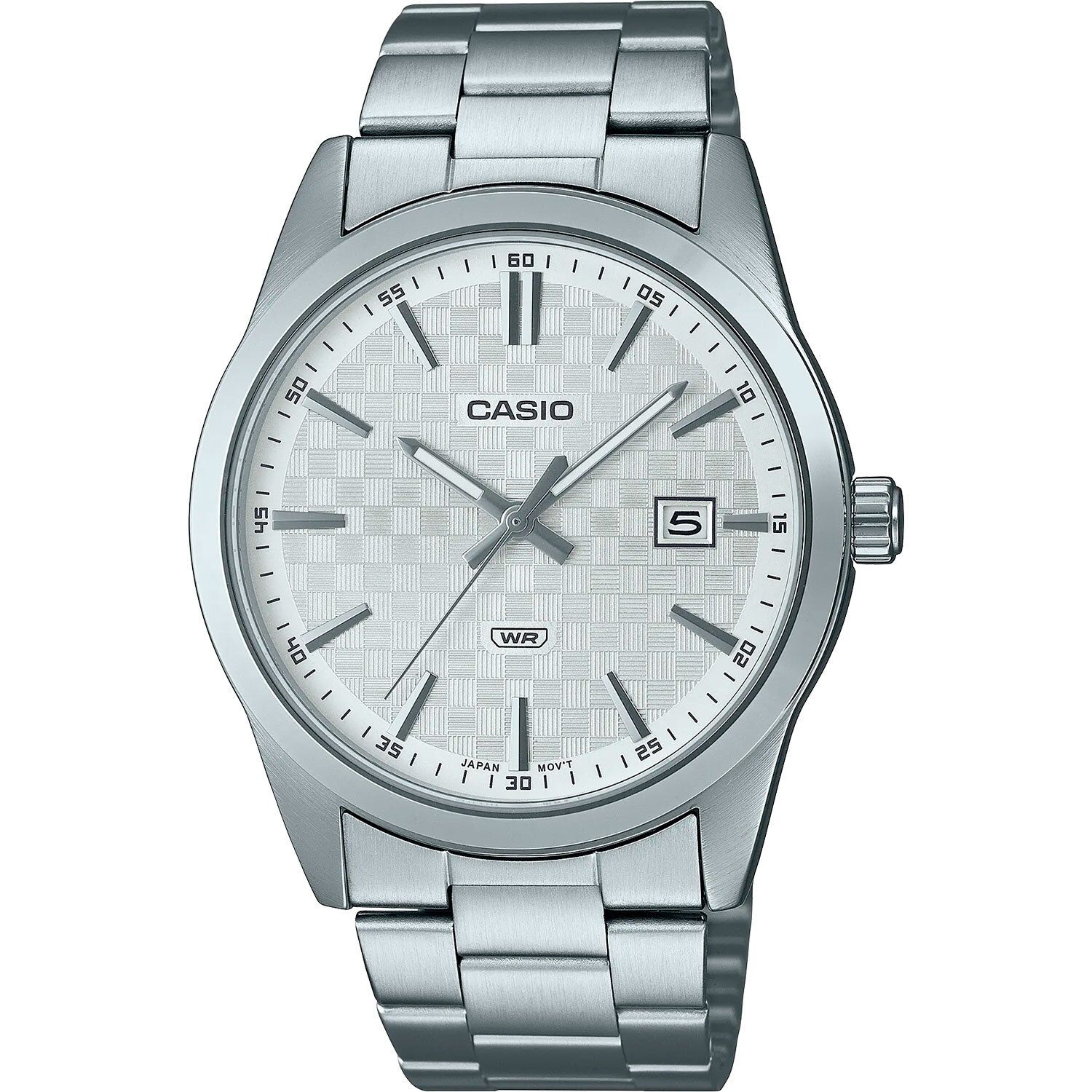 Мужские аналоговые кварцевые часы. Серия Casio Collection. Центральные часовая, минутная и секундная стрелки. Серебристый циферблат с часовыми метками в виде штрихов. Апертура даты в позиции 3 ч. Стрелки с люминесцентным покрытием, которое светится в темноте после непродолжительного нахождения на свету. Устойчивое к мелким механическим повреждениям минеральное стекло. Круглый корпус из нержавеющей стали. Размеры корпуса 41 мм на 48 мм, толщина 9,6 мм. Браслет из нержавеющей стали с тройной раскладывающейся застежкой. Батарейка рассчитана на 3 года. Водонепроницаемость 30WR (защита от брызг). Вес около 106 г.