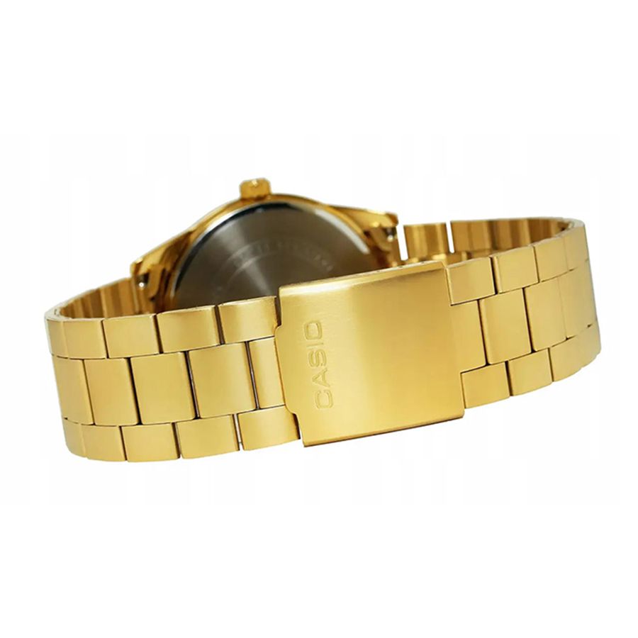 Мужские кварцевые наручные часы с аналоговым отображением времени (стрелочные). Серия Casio Collection. Практичные и удобные часы для повседневного использования. Центральные часовая, минутная и секундная стрелки. Чёрный циферблат с часовыми метками в виде золотистых штрихов. Стрелки с люминесцентным покрытием, которое светится в темноте после непродолжительного воздействия света. Индикация даты в положении 3 часов. Устойчивое к мелким механическим повреждениям минеральное стекло. Круглый стальной корпус с IP покрытием цвета розового золота. Размеры корпуса 48 мм на 41 мм, толщина 9,6 мм. Минутная шкала на циферблате. Стальной браслет с IP покрытием цвета розового золота, тройная раскладывающаяся застежка. Батарейка рассчитана на 3 года. Водонепроницаемость 30WR (защита от брызг). Вес около 106 г.