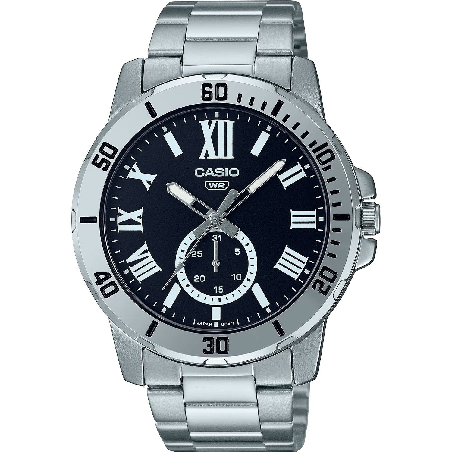 Мужские кварцевые наручные часы с аналоговым отображением времени (стрелочные). Casio Collection. Центральные часовая, минутная и секундная стрелки. Чёрный циферблат с часовыми метками в виде штрихов и римских цифр. Стрелки и метки с люминесцентным покрытием, которое светится в темноте после непродолжительного воздействия света. Стрелочный указатель даты вынесен на отдельный малый циферблат в положении 6 часов. Минутная шкала на безеле. Устойчивое к мелким механическим повреждениям минеральное стекло. Круглый стальной корпус. Размер корпуса 45 мм на 49 мм, толщина 8,7 мм. Переводная головка с защитой. Стальной браслет с тройной раскладывающейся застежкой. Батарея рассчитана на 3 года. Водонепроницаемость 30 WR (защита от брызг). Вес около 112 г.
