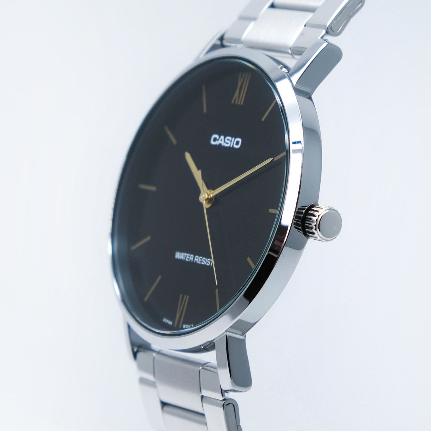 Мужские кварцевые наручные часы с аналоговым отображением времени. Серия Casio Collection. Простые и лаконичные часы на каждый день. Центральные часовая, минутная и секундная стрелки золотистого цвета. Чёрный циферблат с часовыми метками в виде золотистых штрихов и двух римских цифр XII и VI. Круглый стальной корпус размером 46 мм на 40 мм, толщиной 8,2 мм. Рифлёная переводная головка. Стальной браслет с тройной раскладывающейся застежкой. Батарейка рассчитана на 3 года. Водонепроницаемость 30WR (защита от брызг). Вес около 88 г.