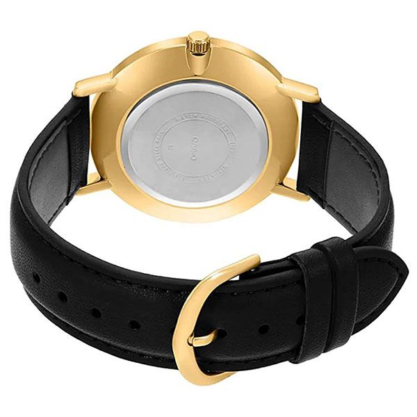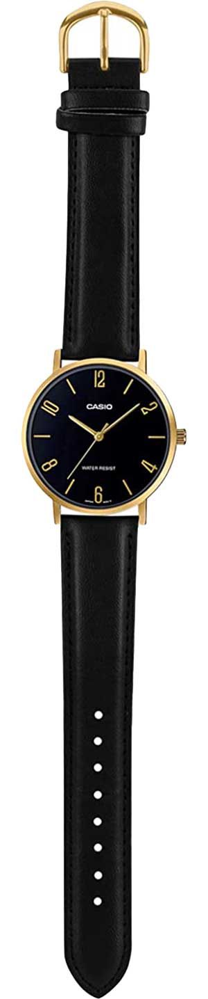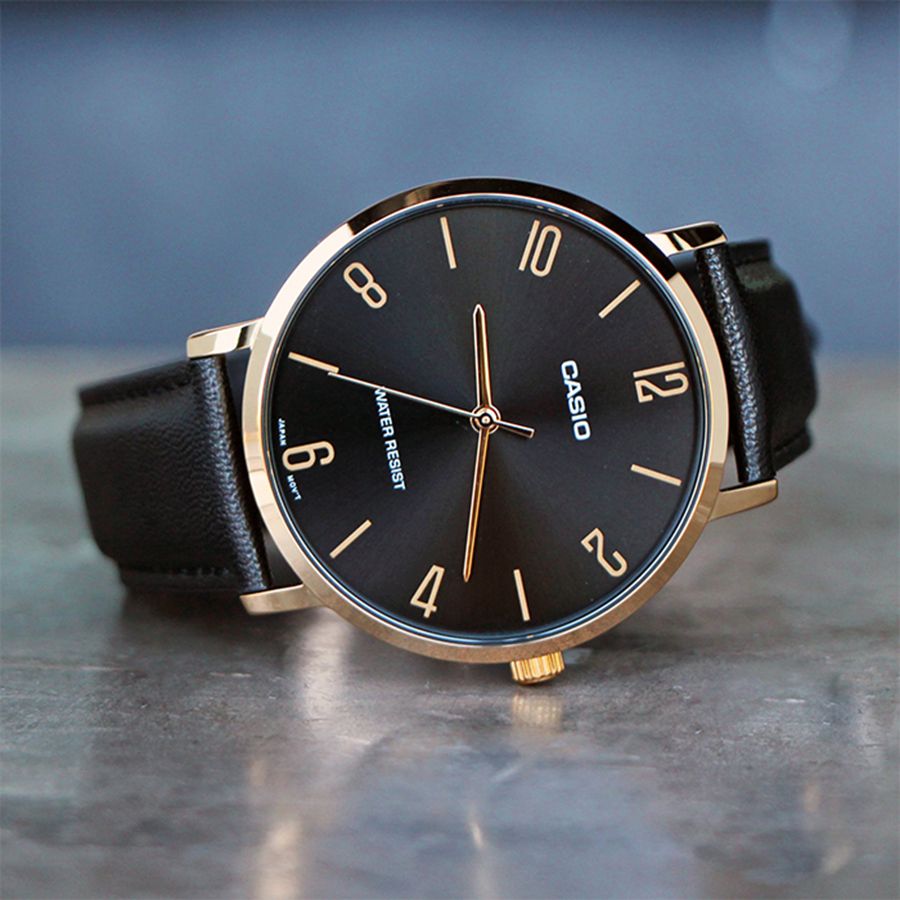 Мужские кварцевые аналоговые часы. Серия Casio Collection. Центральные часовая, минутная и секундная стрелки золотистого цвета. Чёрный циферблат с часовыми метками в виде штрихов и арабских цифр золотистого цвета. Устойчивое к мелким механическим повреждениям минеральное стекло. Круглый корпус золотистого цвета. Размер корпуса 40 мм на 46 мм, толщина 8,2 мм. Рифлёная переводная головка золотистого цвета. Чёрный кожаный ремешок с классической застежкой buckle. Батарея рассчитана на 3 года. Водонепроницаемость 30WR (защита от брызг). Вес около 41 г.