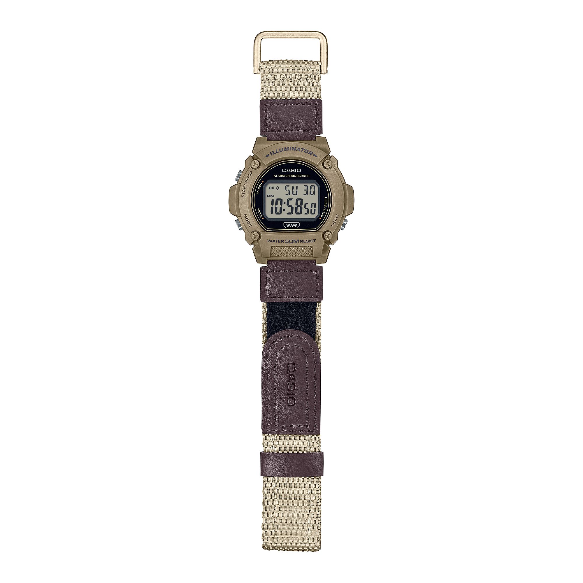 Мужские кварцевые электронные наручные часы. Серия Casio Collection. Дисплей подсвечивается светодиодом. 12-ти и 24-х часовой формат отображения времени. Секундомер с точностью показаний 1/100 с и временем измерения 1ч. Режимы измерений: отдельные отрезки времени, измерение с разделением, два финишных результата. Ежедневный будильник, сигнал начала часа. Автоматический календарь до 2099г (на февраль установлено 28 дней). Круглый корпус из полимерного пластика бежевого цвета. Размеры корпуса 47 мм x 48 мм, толщина 13,9 мм. Бежевый тканевый ремешок с коричневыми кожаными вставками. Ремешок на липучке. Водонепроницаемость 50WR (мытьё рук, дождь). Приблизительный срок службы аккумулятора 7 лет. Вес около 34 г.