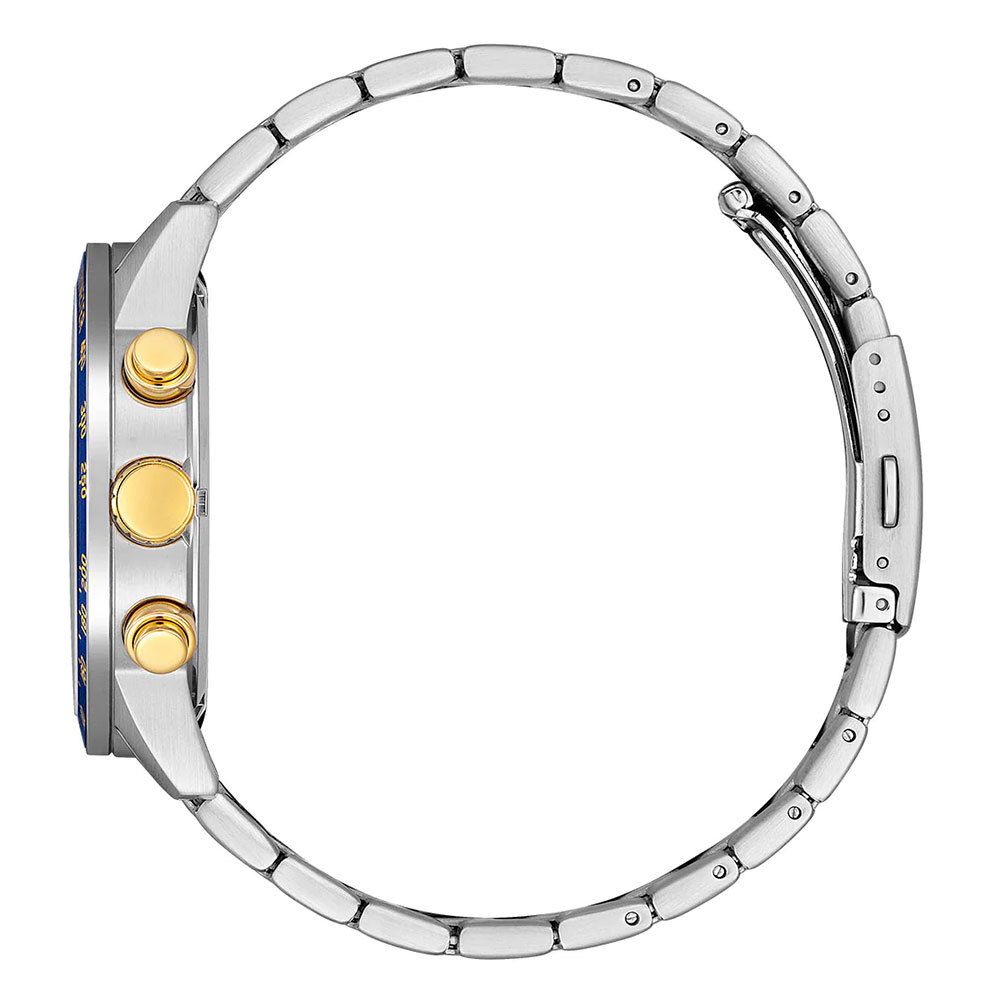 Мужские аналоговые кварцевые наручные часы-хронограф с секундомером. Коллекция Quartz Chronograph. Калибр механизма 0510. Центральные часовая и минутная стрелки, секундная стрелка вынесена на дополнительный малый циферблат в позиции 6 часов. Синий циферблат с часовыми метками в виде штрихов. Стрелки и метки с люминесцентным покрытием, которое светится в темноте после непродолжительного воздействия света. Окошко даты в позиции 3 ч. Секундомер с точностью показаний 1с и временем измерения 12 ч. Минутная шкала на циферблате. Круглый корпус из нержавеющей стали с IP покрытием синего цвета на безеле. Диаметр корпуса 44 мм, толщина 11 мм. Тахиметрическая шкала на безеле (для расчета скорости на основании времени в пути). Устойчивое к мелким механическим повреждениям минеральное стекло. Стальной браслет с частичным IP покрытием цвета розового золота, раскладывающаяся застежка. Завинчивающаяся задняя крышка. Водонепроницаемость 100WR (часы подходят для плавания с маской и трубкой, обычного плавания). Вес около 148 г.