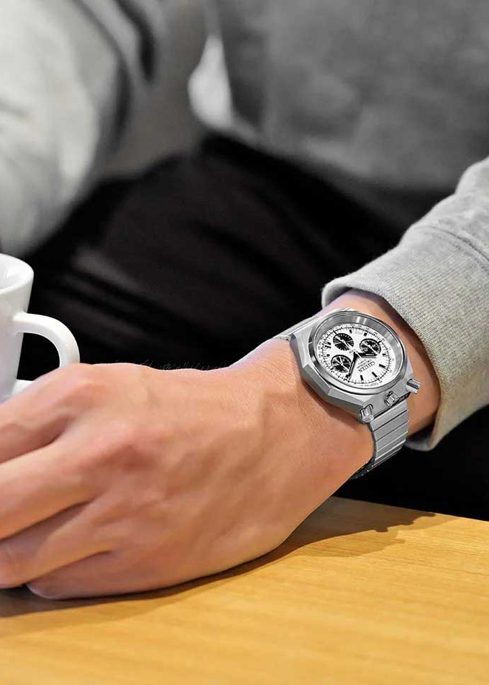 Мужские аналоговые кварцевые часы-хронограф с секундомером. Коллекция Tsuno Chrono Quartz. Винтажный хронограф - идеальное сочетание стиля и практичности. Дизайн часов вдохновлен моделью Citizen Bullhead 1973 года. Калибр механизма Citizen 0510. Центральные часовая и минутная стрелки, секундная стрелка вынесена на дополнительный малый циферблат в позиции 3 часов. Белый циферблат с часовыми метками в виде штрихов. Стрелки и метки с люминесцентным покрытием, которое светится в темноте после непродолжительного воздействия света. Окошко даты в позиции между 4 и 5 часами. Стрелочный указатель времени суток - 24-часовая шкала в положении в позиции 6 часов. Кнопки хронографа и переводная головка расположены в верхней части корпуса (переводная головка в позиции 12 часов). Секундомер с точностью показаний 1с и временем измерения 12 часов. На циферблат нанесена тахиметрическая шкала (для расчета скорости на основании времени в пути). Восьмиугольный стальной корпус. Диаметр корпуса 38 мм, толщина 10,8 мм. Устойчивое к мелким механическим повреждениям минеральное стекло. Стальной браслет шириной 18 мм, регулируемая застежка. Водонепроницаемость WR50 (мытьё рук, дождь).