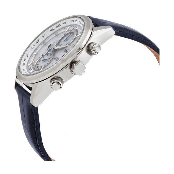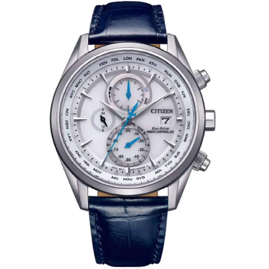 Мужские кварцевые аналоговые часы- хронограф с секундомером на солнечной батарее. Коллекции Eco-Drive Radio-Controlled. Калибр механизма H800. Часы оснащены системой питания и подзарядки от солнечного света Eco-Drive не требующей замены элемента питания. Система Eco-Drive - патентованная технология Ciitizen заключающаяся в размещении фотоэлементов скрытых под циферблатом и постоянно подзаряжающих аккумулятор часов при попадании солнечного света на циферблат часов. Система предупреждения о низком уровне заряда аккумулятора и предотвращения перезарядки. Индикатор запаса хода. Запас хода при полной зарядке аккумулятора около 10 месяцев (в режиме сохранения заряда элемента питания), и около 6 месяцев (без нахождения в режиме сохранения заряда элемента питания). Функция индикации заряда (EOL - End of Life) – в случае, если заряд элемента питания ослабевает, секундная стрелка двигается через деления. Синхронизация времени по радиосигналу (Германия, Япония, США, Китай). Часы созданы с защитой от магнитных полей. Центральные часовая, минутная и секундная стрелки. Белый циферблат с часовыми метками в виде штрихов. Стрелки с люминесцентным покрытием, которое светится в темноте после непродолжительного воздействия света. Окошко даты в позиции 3 ч. Ретроградный стрелочный указатель дня недели вынесен на дополнительный малый циферблат в позиции 6 ч. Секундомер с точностью показаний 1/20 c и временем измерения 1 ч. 12-ти и 24-х часовой формат отображения времени (малый циферблат в позиции 9 ч). Мировое время (26 городов). Вечный календарь..Включение/отключение летнего времени. Круглый стальной корпус диаметром 43 мм, толщиной 10,2 мм. Устойчивое к возникновению мелких царапин сапфировое стекло. Синий кожаный ремешок с раскладывающейся застежкой. Водозащита 100WR (плавание и погружение без акваланга). Вес около 82 г.