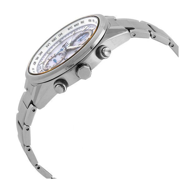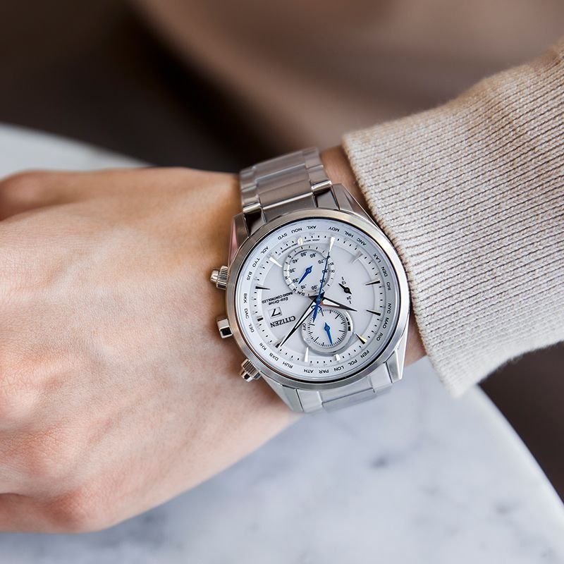 Мужские кварцевые аналоговые часы- хронограф с секундомером на солнечной батарее. Коллекция Eco-Drive Radio-Controlled. Калибр механизма H800. Часы оснащены системой питания и подзарядки от солнечного света Eco-Drive не требующей замены элемента питания. Система Eco-Drive - патентованная технология CIitizen заключающаяся в размещении фотоэлементов скрытых под циферблатом и постоянно заряжающих аккумулятор часов при попадании солнечного света на циферблат. Запас хода при полной зарядке аккумулятора до 180 дней, при включенной функции сохранения энергии до 10 месяцев. Функция индикации заряда (EOL - End of Life) – в случае ослабевания заряда элемента питания секундная стрелка перемещается через 2 деления. Функция предотвращения перезарядки. Автоматическая настройка времени по радиосигналу (Германия, Япония, США, Китай). Центральные часовая, минутная и секундная стрелки. Белый циферблат с часовыми метками в виде штрихов. Стрелки с люминесцентным покрытием, которое светится в темноте после непродолжительного воздействия света. Индикация даты в позиции 3 ч. Ретроградный стрелочный указатель дня недели вынесен на дополнительный малый циферблат в позиции 6 ч. Секундомер с точностью показаний 1/20 c и временем измерения до 1 ч. Стрелочный указатель времени суток - 24-часовая шкала на дополнительном малом циферблате в положении 9 часов. Мировое время (26 городов). Вечный календарь. Включение/отключение летнего времени. Круглый стальной корпус диаметром 43 мм, толщиной 10.2 мм. Устойчивое к возникновению мелких царапин сапфировое стекло. Стальной браслет с раскладывающейся застежкой. Водонепроницаемость 100WR (часы подходят для плавания с маской, трубкой и обычного плавания). Вес около 143 г.