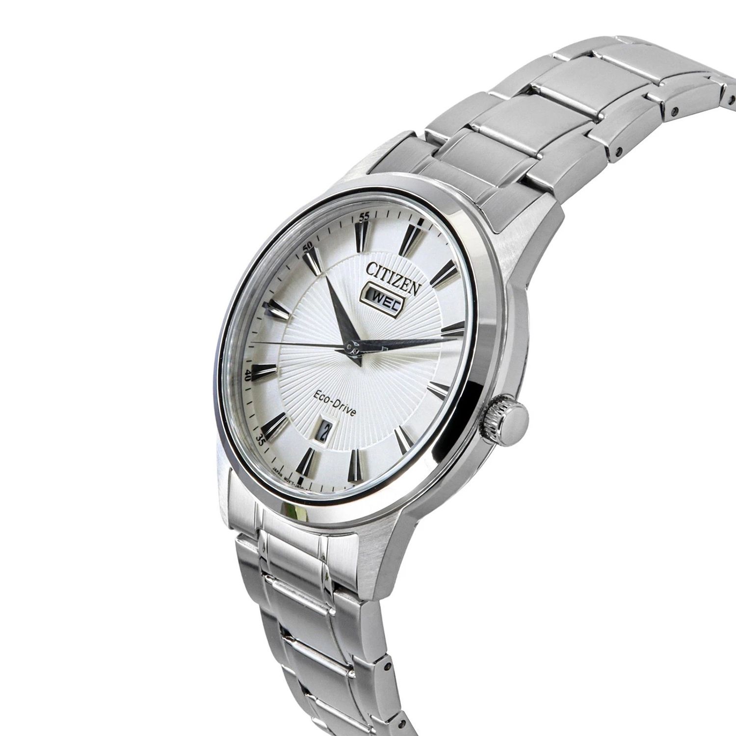 Элегантные мужские кварцевые часы на солнечной батарее с аналоговым отображением времени. Коллекция Eco-Drive. Калибр механизма Citizen J800. Часы оснащены системой питания и подзарядки от солнечного света Eco-Drive не требующей замены элемента питания. Система Eco-Drive - патентованная технология Citizen, заключающаяся в размещении фотоэлементов скрытых под циферблатом и постоянно заряжающих аккумулятор часов при попадании солнечного света на циферблат. Запас хода около 180 дней от полностью заряженной батареи. Функция индикации заряда (EOL - End of Life) – в случае ослабевания заряда элемента питания секундная стрелка двигается через 2 деления. Функция предотвращения перезарядки. Центральные часовая, минутная и секундная стрелки. Окошко даты в позиции 6 часов, дня недели в позиции 12 ч. Серебристый циферблат с часовыми метками в виде штрихов. Круглый стальной корпус диаметром 40 мм, толщиной 10 мм. Устойчивое к мелким механическим повреждениям минеральное стекло. Стальной браслет с тройной раскладывающейся застежкой. Ширина браслета 21 мм. Водонепроницаемость 30WR (защита от брызг).