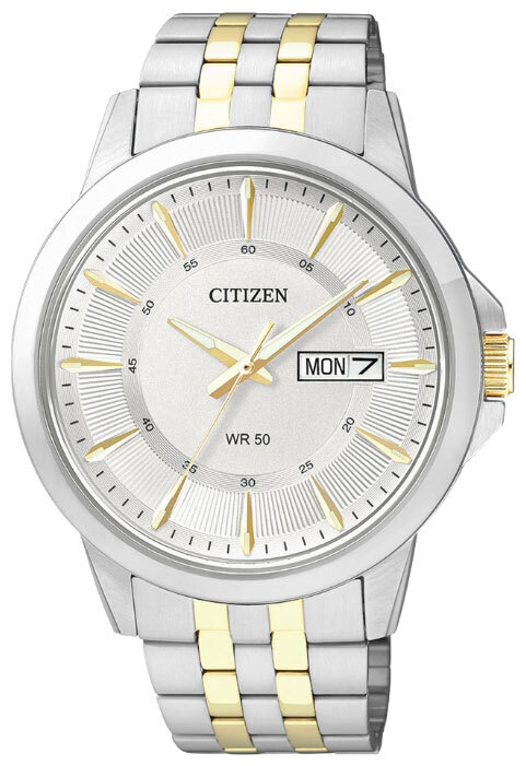 Мужские кварцевые наручные часы с аналоговым отображением времени. Коллекция Basic. Калибр механизма 1502. Центральные часовая, минутная и секундная стрелки. Серебристый циферблат с часовыми метками в виде штрихов. Индикация даты и дня недели в позиции 3 часов. Стрелки и часовые метки с люминесцентным покрытием, которое светится в темноте после непродолжительного воздействия света. Минутная шкала на циферблате. Круглый стальной корпус диаметром 41 мм, толщиной 9 мм. Устойчивое к мелким механическим повреждениям минеральное стекло. Переводная головка с защитой. Стальной браслет с частичным IP покрытием цвета жёлтого золота, раскладывающаяся застёжка. Ширина браслета 20 мм. Батарейка рассчитана на 2 года. Водонепроницаемость 50WR (мытьё рук, дождь). Вес около 113 г.