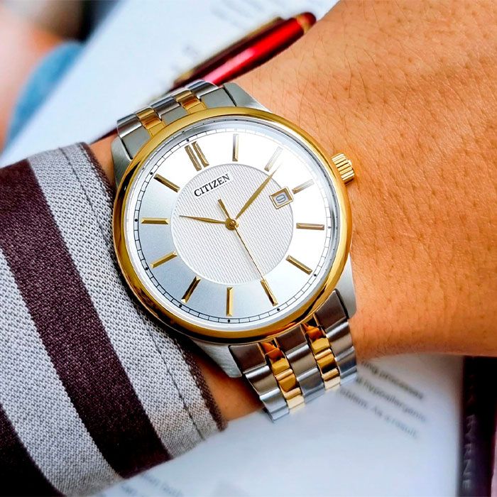 Мужские кварцевые наручные часы с аналоговым отображением времени. Коллекция Basic Dress. Калибр механизма Citizen 1112. Центральные часовая, минутная и секундная стрелки золотистого цвета. Серебристый циферблат с часовыми метками в виде штрихов. Индикация даты в позиции 3 часов. Круглый стальной корпус с I P покрытием цвета жёлтого золота на безеле. Диаметр корпуса 40 мм, толщина 9 мм. Устойчивое к мелким механическим повреждениям минеральное стекло. Стальной браслет с частичным I P покрытием цвета жёлтого золота, раскладывающаяся застежка. Батарейка рассчитана на 2 года. Водонепроницаемость 50WR (мытьё рук, дождь).