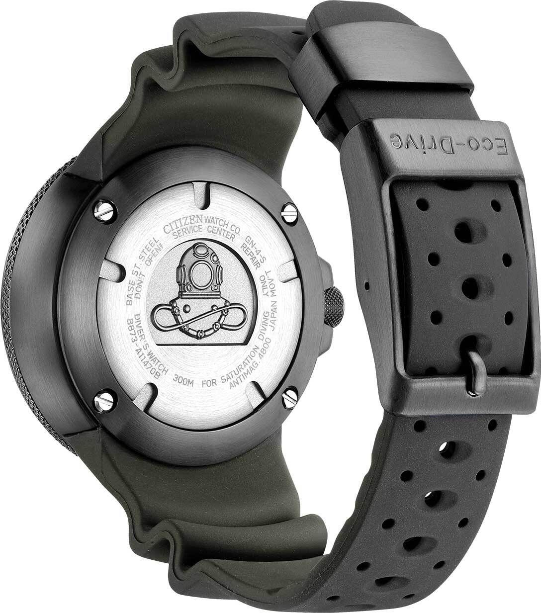 Мужские кварцевые аналоговые часы. Серия Promaster Professional Diver для подводного плаванья. Часы оснащены системой питания и подзарядки от солнечного света Eco-Drive не требующей замены элемента питания. Система Eco-Drive - патентованная технология CITIZEN, заключающаяся в размещении фотоэлементов скрытых под циферблатом и постоянно подзаряжающих аккумулятор часов при попадании солнечного света на циферблат. Запас хода около 180 дней от полностью заряженной батареи. Функция предотвращения перезарядки. Функция индикации заряда EOL - End of Life – в случае ослабевания заряда элемента питания, секундная стрелка двигается через деления. Защищены от магнитных полей — 4800A/m. Калибр механизма Citizen B873. Центральные часовая, минутная и секундная стрелки. Окошко даты в позиции 3 часов. Зелёный циферблат с часовыми метками в виде штрихов. Стрелки и часовые метки с люминесцентным покрытием, которое светится в темноте после непродолжительного воздействия света. Круглый корпус из нержавеющей стали с покрытием чёрного цвета. Диаметр корпуса 48,2 мм, толщина 18,2 мм. Завинчивающаяся стальная задняя крышка с гравировкой водолазного шлема. Устойчивое к мелким механическим повреждениям минеральное стекло. Однонаправленный поворотный безель с минутной шкалой. Винтовая фиксация переводной головки. Переводная головка находится в позиции 9 ч., что обеспечивает комфортное ношение часов на правой руке. Чёрный пластиковый ремешок с дополнительной секцией (для одевания часов поверх гидрокостюма), стандартная застёжка buckle. Водостойкость WR 300 (погружение с аквалангом), часы сертифицированы по стандарту ISO 6425 (дайверские часы). Вес около 194 г.