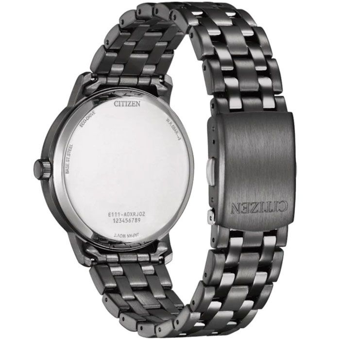 Мужские кварцевые аналоговые часы на солнечной батарее. Коллекция Eco-Drive. Калибр механизма E111. Часы оснащенный системой питания и подзарядки от солнечного света Eco-Drive не требующей замены элемента питания. Система Eco-Drive - патентованная технология Citizen заключающаяся в размещении фотоэлементов скрытых под циферблатом и постоянно заряжающих аккумулятор часов при попадании солнечного света на циферблат. Запас хода при полной зарядке аккумулятора до 180 дней. Функция предотвращения перезарядки. Функция индикации заряда (EOL - End of Life) – в случае ослабевания заряда элемента питания секундная стрелка перемещается через 2 деления. Центральные часовая, минутная и секундная стрелки. Индикация даты в позиции 3 часов. Чёрный циферблат с часовыми метками в виде штрихов. Минутная шкала на циферблате. Устойчивое к мелким механическим повреждениям минеральное стекло. Круглый стальной корпус с чёрным IP покрытием. Диаметр корпуса 40 мм, толщина 10 мм. Стальной браслет с чёрным IP покрытием, раскладывающаяся застежка. Ширина браслета 20мм, Водонепроницаемость 50WR (мытьё рук, дождь). Вес около 107 г
