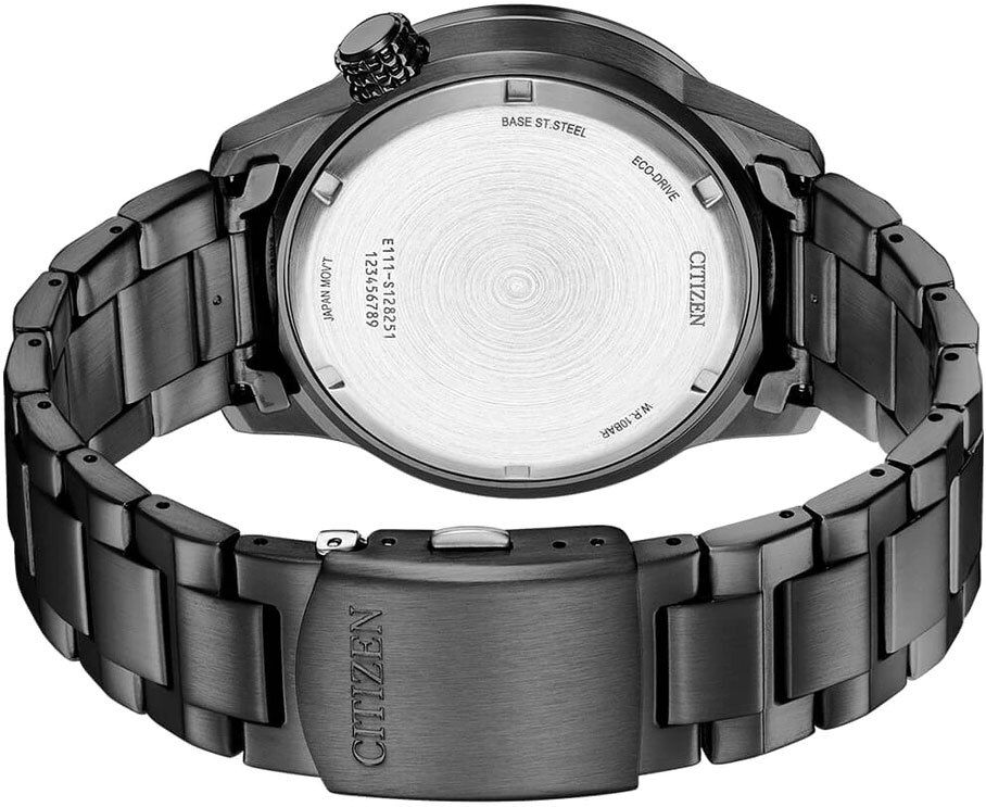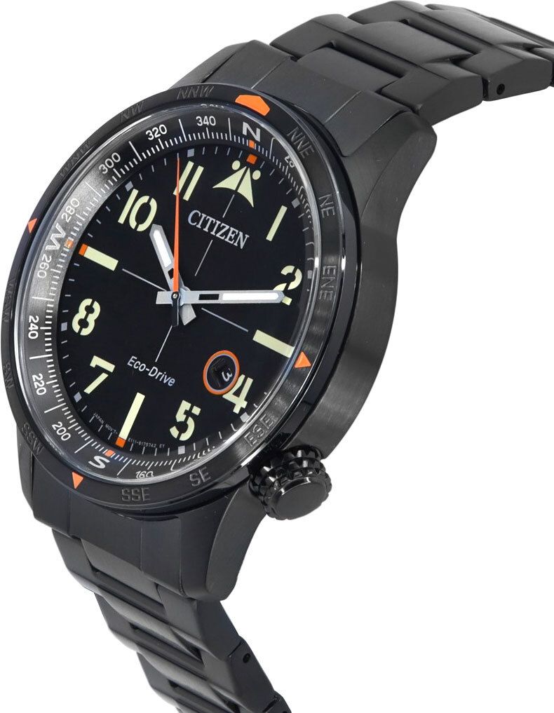 Мужские кварцевые аналоговые наручные часы на солнечной батарее. Коллекция Eco-Drive. Часы выполнены в стиле милитари-авиатор: черный циферблат в стиле компаса с культовым дизайном перекрестия, яркими светящимися маркерами и серо-оранжевыми стрелками. Калибр механизма E111. Часы оснащенный системой питания и подзарядки от солнечного света Eco-Drive не требующей замены элемента питания. Система Eco-Drive - патентованная технология Citizen заключающаяся в размещении фотоэлементов скрытых под циферблатом и постоянно заряжающих аккумулятор часов при попадании солнечного света на циферблат. Запас хода при полной зарядке аккумулятора около 180 дней. Функция предотвращения перезарядки. Функция индикации заряда (EOL - End of Life) – в случае ослабевания заряда элемента питания секундная стрелка перемещается через 2 деления. Центральные часовая, минутная и секундная стрелки. Чёрный циферблат с часовыми метками в виде арабских цифр и штрихов. На стрелки и часовые метки нанесено люминесцентное покрытие, которое светится в темноте после непродолжительного воздействия света. Индикация даты в положении 4 часов. Шкала компаса по внешнему краю циферблата. Круглый стальной корпус с IP покрытием чёрного цвета. Диаметр корпуса 43 мм, толщина 11,5 мм. Устойчивое к мелким механическим повреждениям минеральное стекло. Рифлёная переводная головка в положении 4 часов. Стальной браслет с IP покрытием чёрного цвета, раскладывающаяся застежка. Завинчивающаяся задняя крышка. Водонепроницаемость 100WR (часы подходят для плавания с маской, трубкой, обычного плавания). Вес около 145 г.