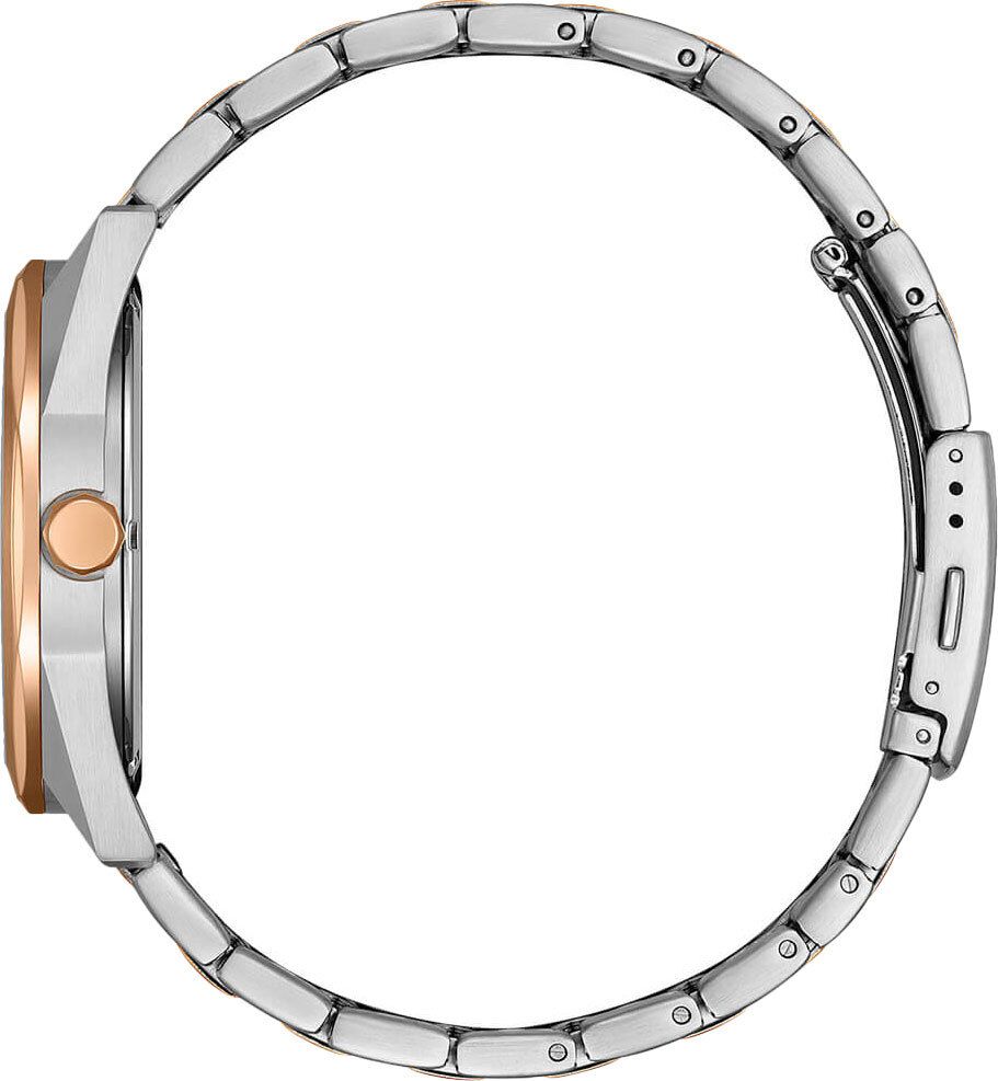 Мужские кварцевые аналоговые часы на солнечной батарее. Коллекция Eco-Drive. Калибр механизма Citizen E111. Часы оснащенный системой питания и подзарядки от солнечного света Eco-Drive не требующей замены батарейки. Система Eco-Drive - патентованная технология Citizen, заключающаяся в размещении фотоэлементов скрытых под циферблатом и постоянно заряжающих аккумулятор часов при попадании солнечного света на циферблат. Запас хода до 180 дней от полностью заряженной батареи. Функция индикации заряда (EOL - End of Life) – в случае ослабевания заряда элемента питания секундная стрелка перемещается с интервалом в 2 секунды. Функция предотвращения перезарядки. Центральные часовая, минутная и секундная стрелки. Синий циферблат с часовыми метками в виде золотистых штрихов. На стрелки и часовые метки нанесено люминесцентное покрытие, которое светится в темноте после непродолжительного воздействия света. Индикация даты в положении 3 часов. Стальной корпус диаметром 41 мм, толщиной 9,7 мм. Стальной восьмиугольный безель с IP покрытием цвета розового золота. Устойчивое к мелким механическим повреждениям минеральное стекло. Рифлёная переводная головка в положении 3 часов. Стальной браслет с частичным IP покрытием цвета розового золота, раскладывающаяся застежка. Завинчивающаяся задняя крышка. Водонепроницаемость 100WR (часы подходят для плавания с маской, трубкой, обычного плавания). Вес около 125 г.