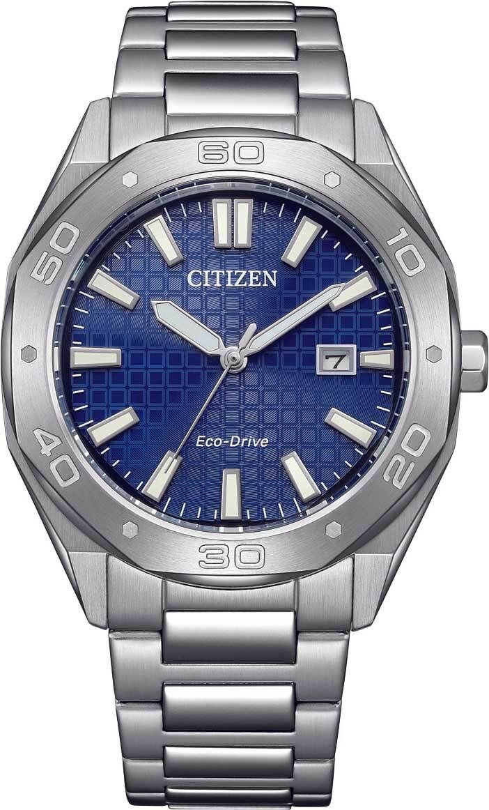 Мужские кварцевые аналоговые часы на солнечной батарее. Коллекция Eco-Drive. Калибр механизма E111. Часы оснащенный системой питания и подзарядки от солнечного света Eco-Drive не требующей замены элемента питания. Система Eco-Drive - патентованная технология Citizen заключающаяся в размещении фотоэлементов скрытых под циферблатом и постоянно заряжающих аккумулятор часов при попадании солнечного света на циферблат. Запас хода при полной зарядке аккумулятора до 180 дней. Функция предотвращения перезарядки. Функция индикации заряда (EOL - End of Life) – в случае ослабевания заряда элемента питания секундная стрелка перемещается через 2 деления. Центральные часовая, минутная и секундная стрелки. Индикация даты в позиции 3 часов. Синий циферблат с часовыми метками в виде штрихов. На стрелки и часовые метки нанесено люминесцентное покрытие, которое светится в темноте после непродолжительного воздействия света. Устойчивое к мелким механическим повреждениям минеральное стекло. Стальной корпус диаметром 41 мм, толщиной 9,7 мм. Минутная шкала на безеле. Стальной браслет с раскладывающейся застежкой. Ширина браслета 22 мм. Завинчивающаяся задняя крышка. Водонепроницаемость 100WR (часы подходят для плавания с маской, трубкой, обычного плавания). Вес около 136 г