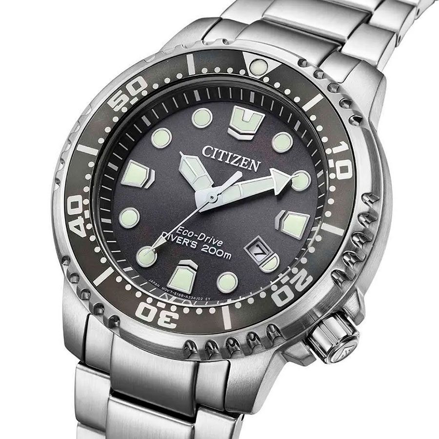 Мужские кварцевые часы на солнечной батарее с аналоговым отображением времени. Коллекция Eco-Drive Promaster Diver для подводных погружений. Калибр механизма Citizen E168. Питание от солнечной энергии - часы оснащены системой Eco-Drive не требующей замены батарейки (система Eco-Drive - патентованная технология Citizen, заключающаяся в размещении фотоэлементов скрытых под циферблатом и постоянно подзаряжающих аккумулятор часов при попадании солнечного света на циферблат). Запас хода около 180 дней от полностью заряженной батареи. Функция индикации заряда (EOL - End of Life) – в случае ослабевания заряда элемента питания секундная стрелка двигается через 2 деления. Функция предотвращения перезарядки. Центральные часовая, минутная и секундная стрелки. Окошко даты в позиции 4 часов. Серый циферблат с часовыми метками в виде штрихов и точек. Стрелки и часовые метки с люминесцентным покрытием, которое светится в темноте после непродолжительного воздействия света. Круглый корпус из нержавеющей стали с серым IP покрытием на безеле. Диаметр корпуса 44 мм, толщина 11,5 мм. Однонаправленный поворотный безель для определения времени погружения. Завинчивающаяся переводная головка с защитой в позиции 4 часов. Устойчивое к мелким механическим повреждениям минеральное стекло. Стальной браслет с раскладывающейся застежкой. Завинчивающаяся задняя крышка. Водонепроницаемость WR200 (погружение с аквалангом) — часы сертифицированы по стандарту ISO 6425 (дайверские часы). Вес около 178 г.