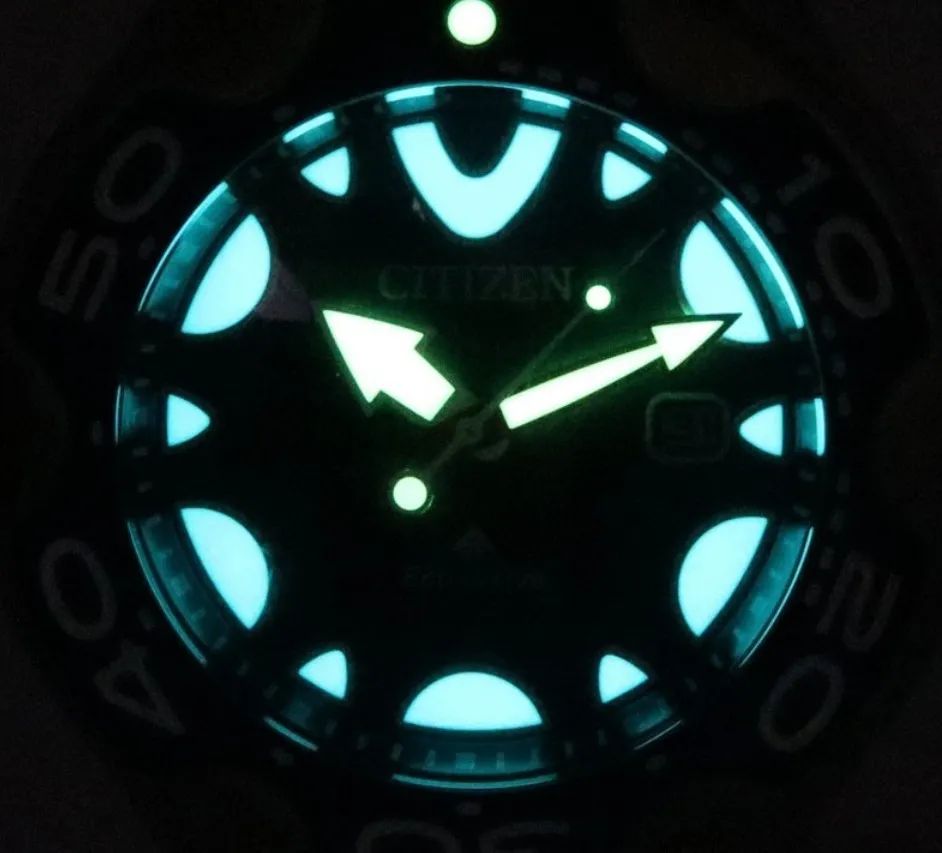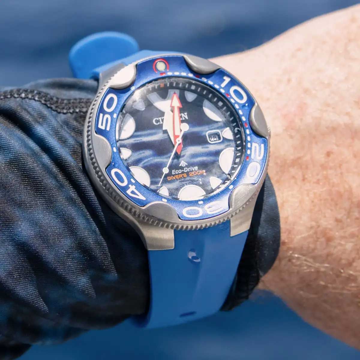 Мужские кварцевые аналоговые часы на солнечной батарее. Коллекция Eco-Drive Promaster Dive для подводных погружений. Дизайн часов вдохновлен величественным внешним видом кита-касатки - белые эллиптические часовые метки и углубления на безеле напоминают формы касатки. Калибр механизма Citizen E168. Часы оснащены системой питания и подзарядки от солнечного света Eco-Drive не требующей замены элемента питания. Система Eco-Drive - патентованная технология Citizen, заключающаяся в размещении фотоэлементов скрытых под циферблатом и постоянно заряжающих аккумулятор часов при попадании солнечного света на циферблат. Запас хода до 180 дней от полностью заряженной батареи. Функция индикации заряда (EOL - End of Life) – в случае ослабевания заряда элемента питания секундная стрелка перемещается через 2 деления. Функция предотвращения перезарядки. Центральные часовая, минутная и секундная стрелки. Индикация даты в позиции 3 часов. Синий циферблат с часовыми метками в виде точек. Стрелки и часовые метки с люминесцентным покрытием, которое светится в темноте после непродолжительного воздействия света. Круглый корпус из нержавеющей стали с IP покрытием синего цвета на безеле. Диаметр корпуса 46 мм, толщина 14,6 мм. Однонаправленный поворотный безель с минутной шкалой для определения времени погружения. Завинчивающаяся переводная головка. Устойчивое к мелким механическим повреждениям минеральное стекло. Синий пластиковый ремешок с классической застёжкой buckle. Завинчивающаяся задняя крышка с силуэтом касатки. Водонепроницаемость WR200 (часы подходят для любительского дайвинга) — часы сертифицированы по стандарту ISO 6425 (дайверские часы). Вес около 122 г.