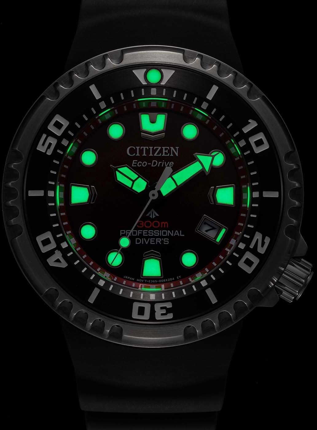 Мужские кварцевые аналоговые часы на солнечной батарее. Коллекция Eco-Drive Promaster Professional Dive для подводных погружений. Калибр механизма Citizen E365. Часы оснащены системой питания и подзарядки от солнечного света Eco-Drive не требующей замены элемента питания. Система Eco-Drive - патентованная технология Citizen, заключающаяся в размещении фотоэлементов скрытых под циферблатом и постоянно заряжающих аккумулятор часов при попадании солнечного света на циферблат. Запас хода до 365 дней от полностью заряженной батареи. Функция индикации заряда (EOL - End of Life) – в случае ослабевания заряда элемента питания секундная стрелка перемещается через 2 деления. Функция предотвращения перезарядки. Часы созданы с защитой от магнитных полей. Центральные часовая, минутная и секундная стрелки. Индикация даты в позиции 3 часов. Красный циферблат с часовыми метками в виде штрихов и точек. Стрелки и часовые метки с люминесцентным покрытием, которое светится в темноте после непродолжительного воздействия света. Круглый корпус из нержавеющей стали с чёрным покрытием на безеле. Диаметр корпуса 46 мм, толщина 16,3 мм. Однонаправленный поворотный безель с минутной шкалой. Гелиевый декомпрессионный клапан. Завинчивающаяся переводная головка с защитой в позиции 4 часов. Устойчивое к возникновению мелких царапин сапфировое стекло с антибликовым покрытием. Чёрный ремешок изготовлен из BENEBiOLTM*2, полиуретана растительного происхождения (устойчив к гидролизу во влажной среде и оказывает меньшее воздействие на окружающую среду), классическая застёжка buckle. В комплекте дополнительная секция для одевания часов поверх гидрокостюма. Завинчивающаяся задняя крышка украшена гравировкой водолазного шлема – универсального символа дайверов. Водонепроницаемость WR300 (сертифицированные часы для дайвинга - подходят для погружений с аквалангом на глубину до 300 метров продолжительностью до 2 часов (ISO 6425) ). Вес около 143 г.