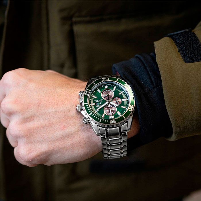 Мужские кварцевые аналоговые часы-хронограф с секундомером на солнечной батарее. Коллекция Eco-Drive Promaster Dive для подводных погружений. Калибр механизма Citizen B612. Часы оснащенный системой питания и подзарядки от солнечного света Eco-Drive не требующей замены батарейки. Система Eco-Drive - патентованная технология компании Citizen, заключающаяся в размещении фотоэлементов скрытых под циферблатом и постоянно заряжающих аккумулятор часов при попадании солнечного света на циферблат. Время работы при полностью заряженной батареи до 210 дней. Функция индикации заряда (EOL - End of Life) – в случае ослабевания заряда элемента питания, секундная стрелка двигается с интервалом в 2 секунды. Функция предотвращения перезарядки аккумулятора. Зелёный циферблат с часовыми метками в виде штрихов. Центральные часовая и минутная стрелки, секундная стрелка вынесена на дополнительный малый циферблат в позиции 6 ч. Стрелки и часовые метки с люминесцентным покрытием, которое светится в темноте после непродолжительного воздействия света. Индикация даты в позиции 3 ч. Время в 24-х часовом формате вынесено на отдельный малый циферблат в позиции 9ч. Секундомер с точностью показаний 1/5c и временем измерения 1ч. Круглый стальной корпус с зелёным IP покрытием на безеле. Диаметр корпуса 44,5 мм, толщина 13.8 мм. Однонаправленный поворотный безель с минутной шкалой для определения времени погружения. Устойчивое к мелким механическим повреждениям минеральное стекло. Завинчивающаяся переводная головка с защитой. Стальной браслет с раскладывающейся застежкой. Завинчивающаяся задняя крышка. Водонепроницаемость WR200 (часы подходят для любительского дайвинга) — часы сертифицированы по стандарту ISO 6425 (дайверские часы). Вес около 192 г.