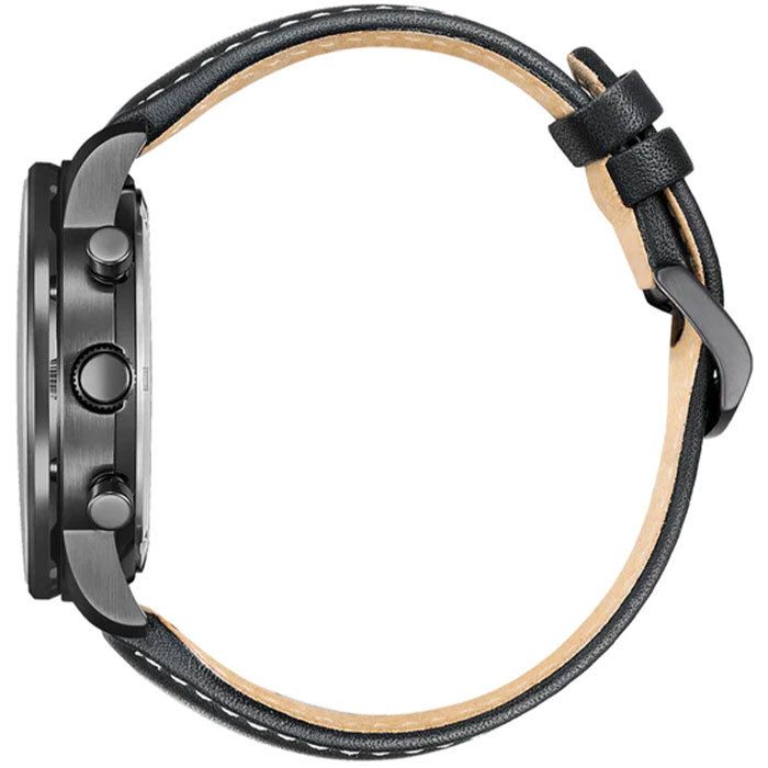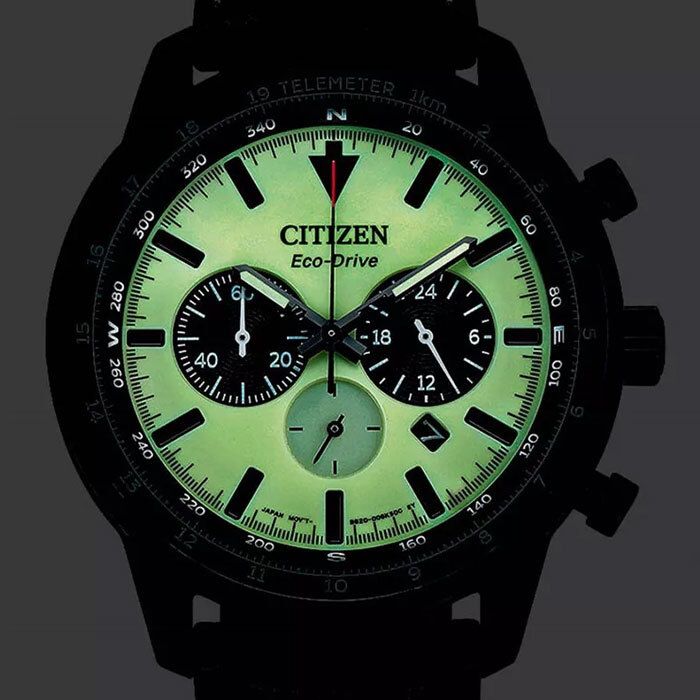 Мужские кварцевые аналоговые наручные часы-хронограф с секундомером. Коллекция Eco-Drive Chrono. Часы оснащенный системой питания и подзарядки от солнечного света Eco-Drive не требующей замены элемента питания. Калибр механизма Citizen B620 . Система Eco-Drive - патентованная технология Citizen заключающаяся в размещении фотоэлементов скрытых под циферблатом и постоянно подзаряжающих аккумулятор часов. Функция индикации заряда (EOL - End of Life) – в случае, если заряд элемента питания ослабевает, секундная стрелка начинает двигаться через деления. Функция предотвращения перезаряда. Время работы при полностью зараженной батарее около 270 дней. Центральные часовая и минутная стрелки. Секундная стрелка вынесена на отдельный малый циферблат в положении 6 ч. Стрелки с люминесцентным покрытием, которое светится в темноте после непродолжительного воздействия света. Зелёный циферблат с часовыми метками в виде штрихов. Циферблат с люминесцентным покрытием -светится в темноте после воздействия света. Индикация даты в положении между 4 и 5 ч. Стрелочный указатель времени суток - 24-часовая шкала в положении 3 часов. Секундомер с точностью показаний 1/5сек и временем измерения 1ч. Устойчивое к мелким механическим повреждениям минеральное стекло. Круглый стальной корпус с покрытием чёрного цвета. Диаметр корпуса 44 мм, толщина 13 мм. Безель с телеметрическй шкалой (для определения расстояния до источника звука) и шкалой солнечного компаса (азимут). Чёрный кожаный ремешок с классической застёжкой buckle. Водозащита 100 WR (плавание и погружение без акваланга). Вес около 89 г.