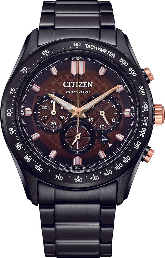 Мужской кварцевый хронограф. Часы оснащены системой Eco-Drive не требующей замены батарейки. Питание от солнечной энергии. Функция предотвращения перезарядки. Функция индикации заряда (EOL). Калибр механизма Citizen B620. Центральные часовая и минутная стрелки, секундная стрелка вынесена на малый циферблат. Апертура даты между 4 и 5 часами. 12/24х часовой формат времени. Секундомер. Тахиметр. Коричневый циферблат. Люминесцентные стрелки и часовые метки. Круглый корпус выполнен из нержавеющей стали с IP покрытием. Диаметр корпуса составляет 43 мм, толщина 11,3 мм. Стальной браслет с IP покрытием, раскладывающаяся застежка. Прочное минеральное стекло устойчивое к мелким механическим повреждениям. Водостойкость WR 100 (плавание без погружения).